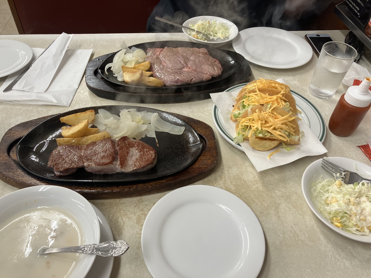 ゆいレール旭駅から徒歩で行きました。月曜の15時前に到着したので待ち時間はゼロで案内してもらえました。テンダーローインのSとニューヨークのL、タコス3個を注文。タコスの皮はハードタイプ、1個から注文可。ステーキはスープとサラダ、ライスかパンがつきます。テンダーとタコスは美味しかったです。会計が現金かJCBカードのみでした。また機会があれば行きたいです。