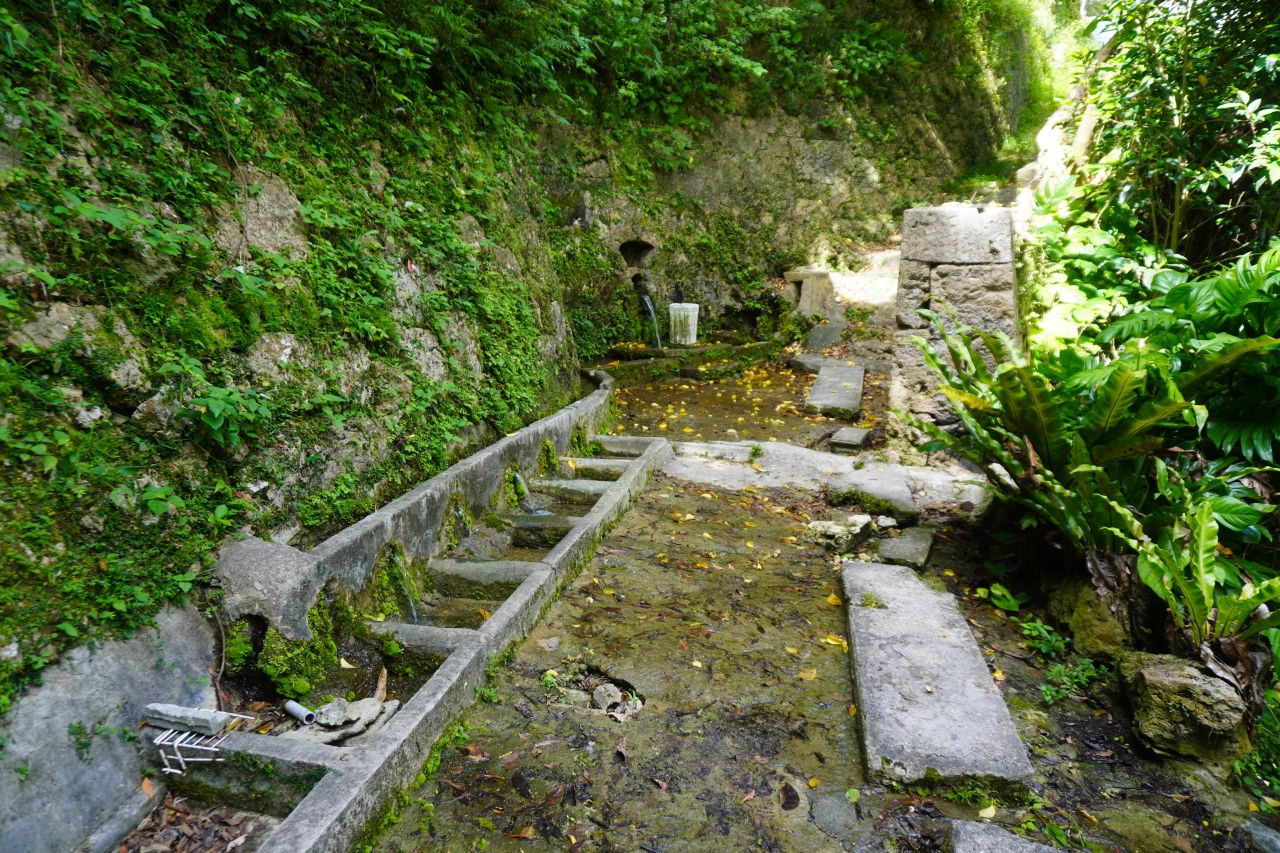 宝口樋川は、川沿いの細い道を行った先なのですが、その細い道の入り口がかなり分かりにくくて苦労しました。崖の下のような場所ですが、水は豊富。水の出る口は一つですが、そこから小さな水路を通って、いくつかの水汲み場に水が流れています。秘密の場所感もすごいと思います。