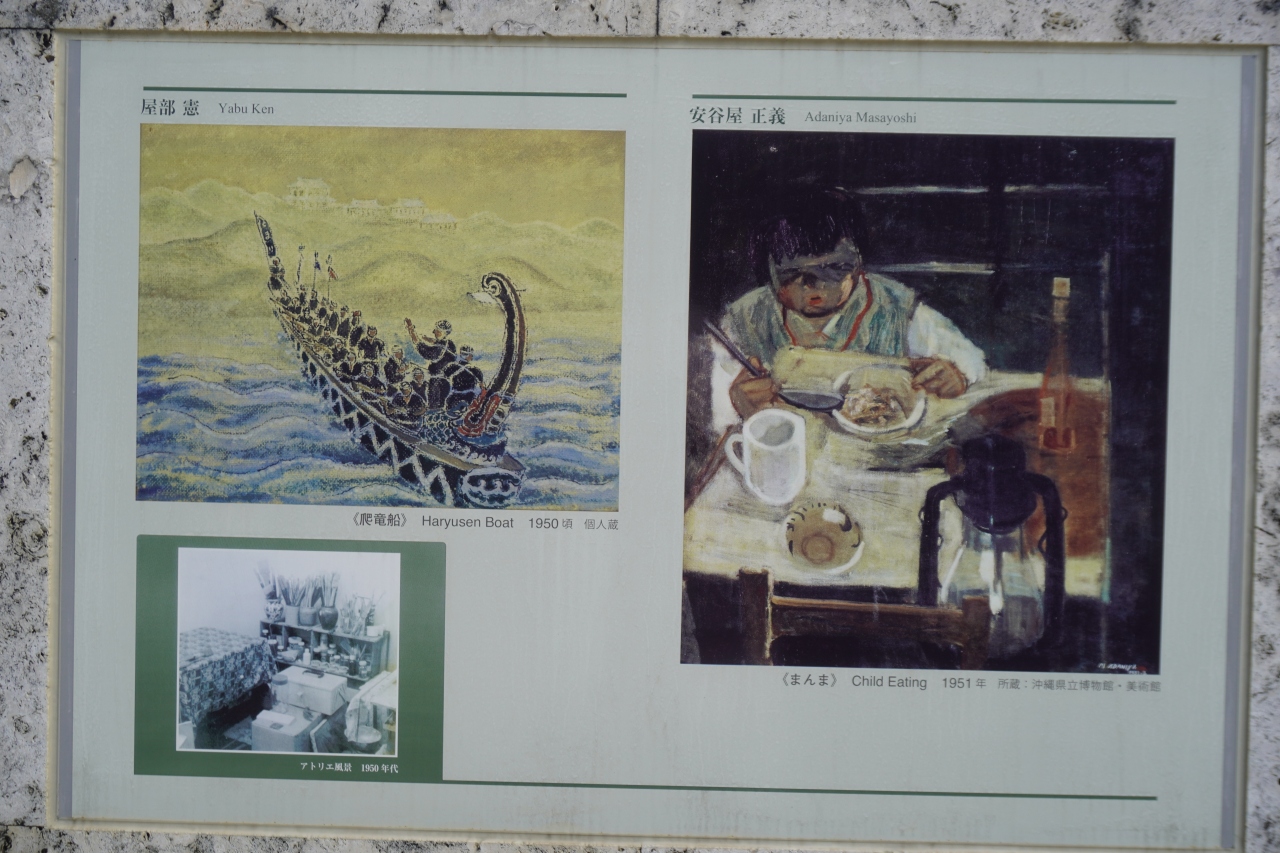 沖縄戦の後、画家達が多く居住した地区。米軍の政策でいったんは今のうるま市に集められた画家達は、首里での活動を希望し、ここに美術村の建設を許可される。沖縄の戦後の美術活動復興の原点となった場所のよう。当時の作品を紹介する陶板のモニュメントもありました。