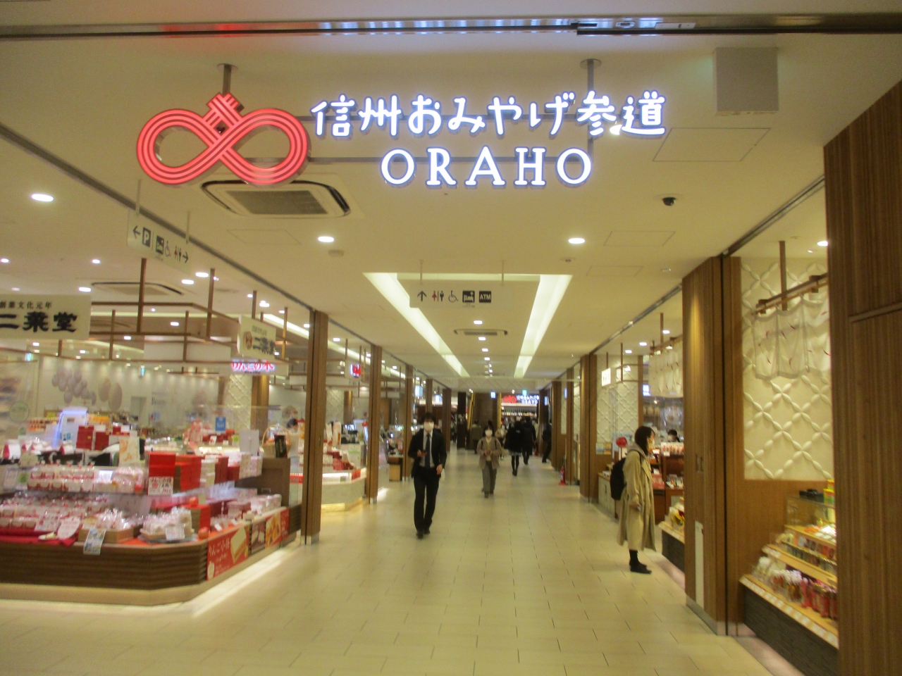 信州おみやげ参道ORAHOはJR長野駅に隣接している駅ビルステーションビルMIDORIの2階にあるショッピング街です。ORAHOとは自分たちのものという意味があるそうです。地元の日本酒、ワイン、蕎麦、お菓子などいろいろな土産が並んでいました。