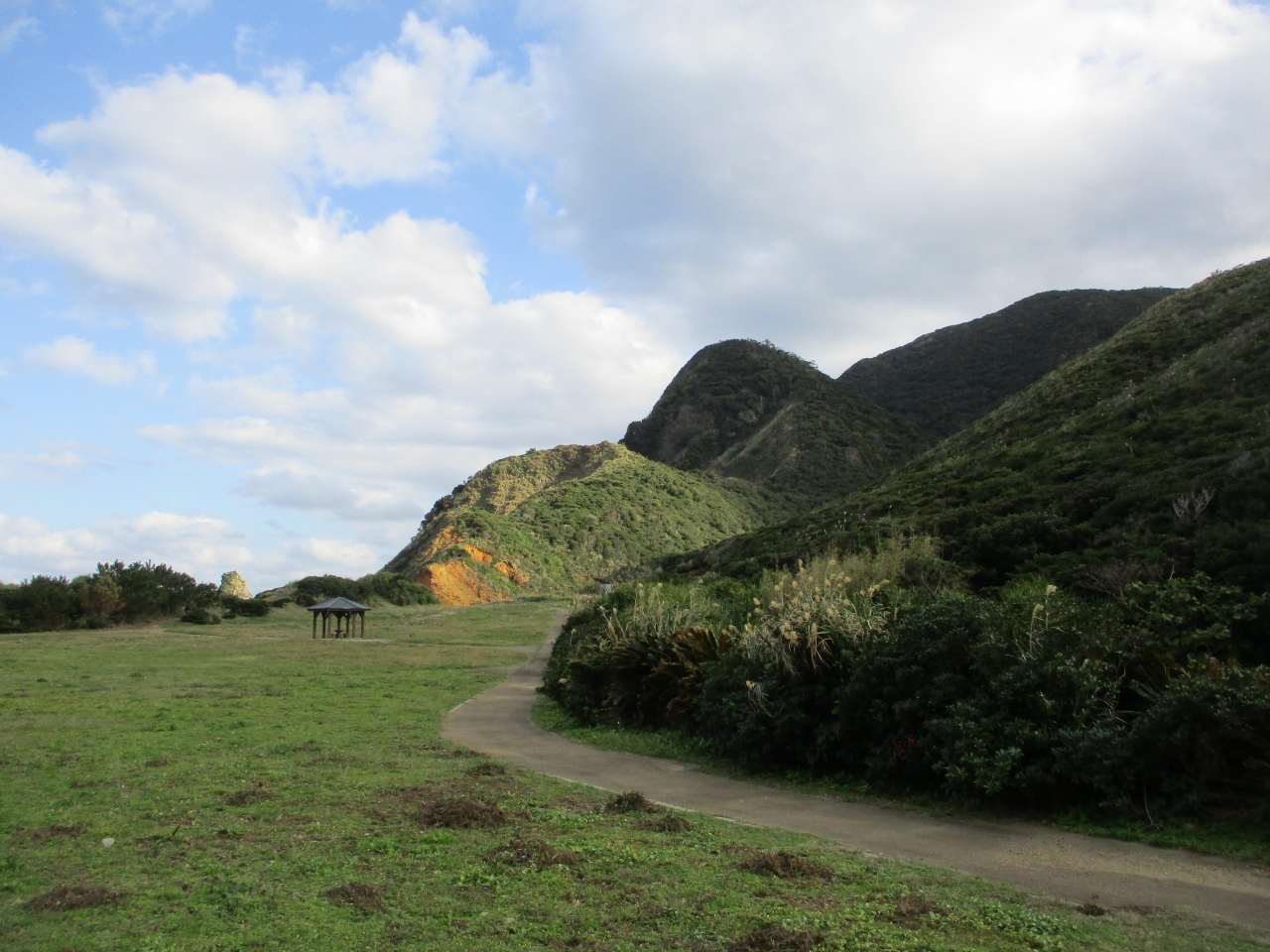 マネン崎展望所からホノホシ海岸まで約6kmあり、車で約15分くらいで到着しました。海岸に出る前、周囲には緑が広がっているところがありました。この海岸の大きな特徴は石でした。砂浜がなく、大きめの石がしきつめられていました。