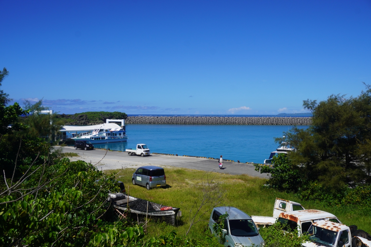 徳仁港は、久高島の玄関口。防波堤で守られた小さな港です。周囲には何もなくて、徳仁港船待合所までだらだらと長い坂を上って行く必要があります。ただ、船を降りてすぐの空き地にレンタサイクルとかのお店がありました。近いので手っ取り早くここを利用する人もいましたが、けっこういい値段のような気がします。