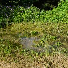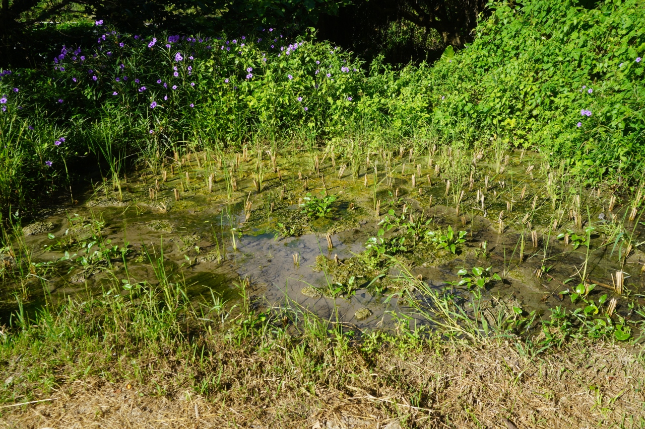 受水走水は、新原ビーチからそのまま東に向かって少し進んだところ。道から少し脇に入っていくと水源と小さな田んぼがありました。ここは東御廻りの拝所の一つで、琉球での稲作発祥の地と伝えられる聖地。アマミキヨがギライカナイから稲の種子を持ってきて植え始めたと伝えられます。