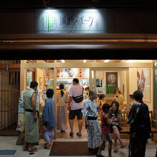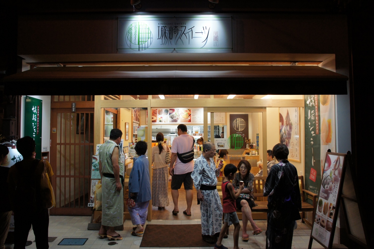 城崎スイーツは、城崎の温泉街の中心部。湯めぐりで一服しようと大勢の観光客が立ち寄る大人気のお店。大きな構えのお店ではないのですが、なんかちょっといい雰囲気もありますよね。お店の前にはちょっとした腰掛もあるし、温泉街に馴染むお店です。