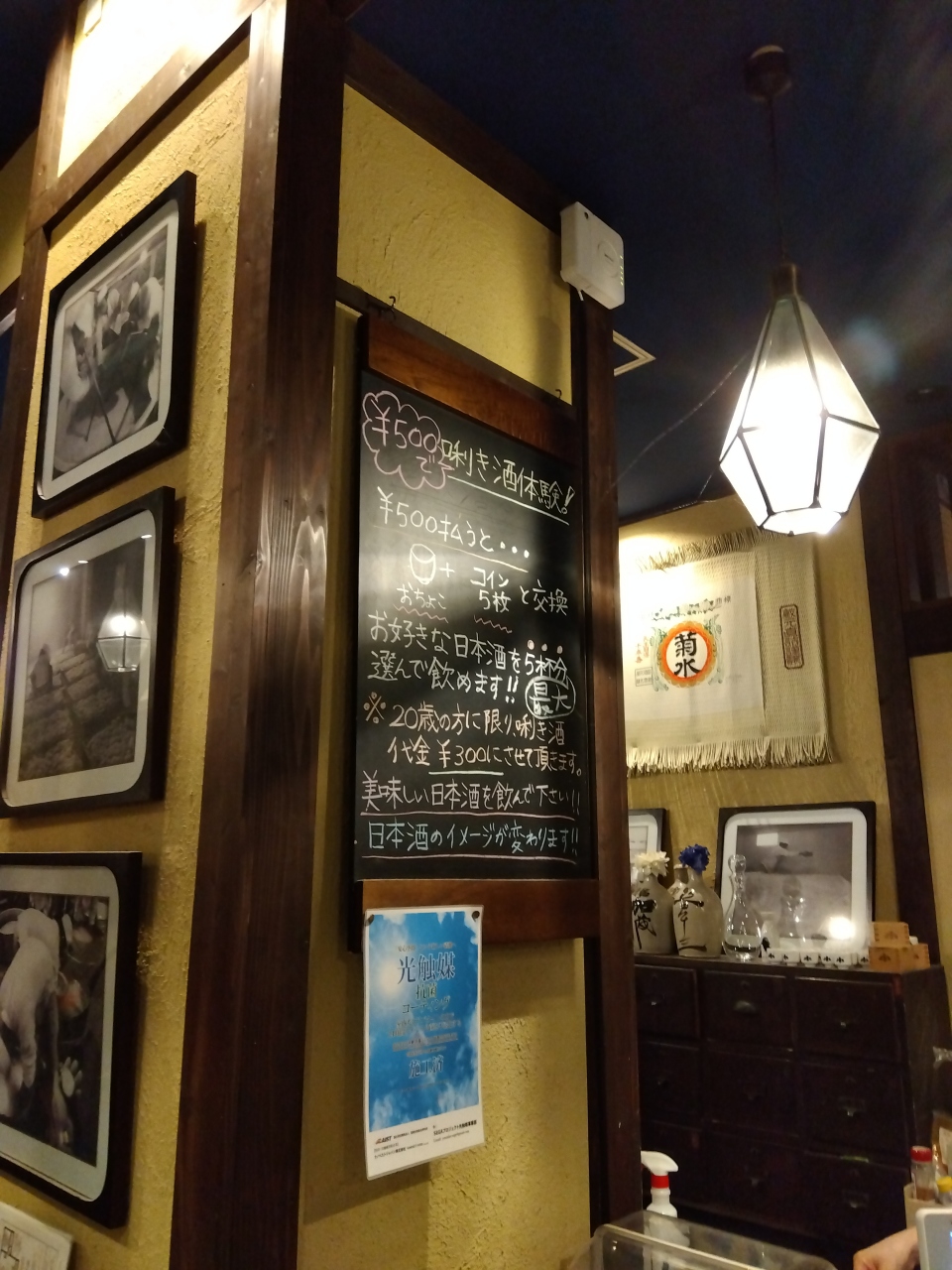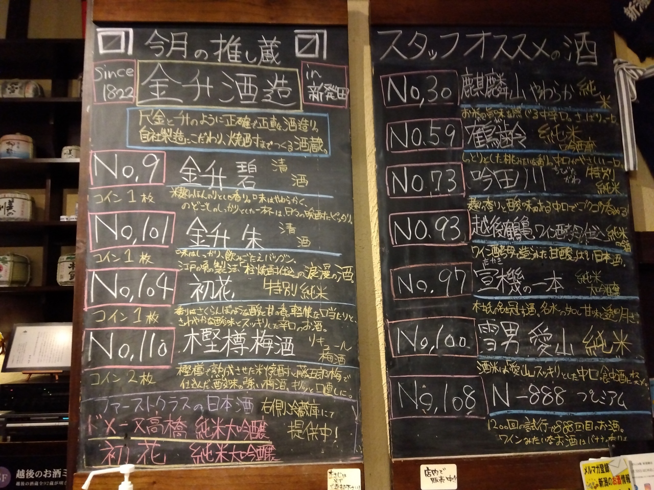 100種類以上あり、迷ってしまう場合は、壁の黒板に書いてある「今月の推し蔵」、「スタッフオススメの酒」、壁に貼ってある「人気ランキング」や「辛口コース」などを参考にすることもできます。