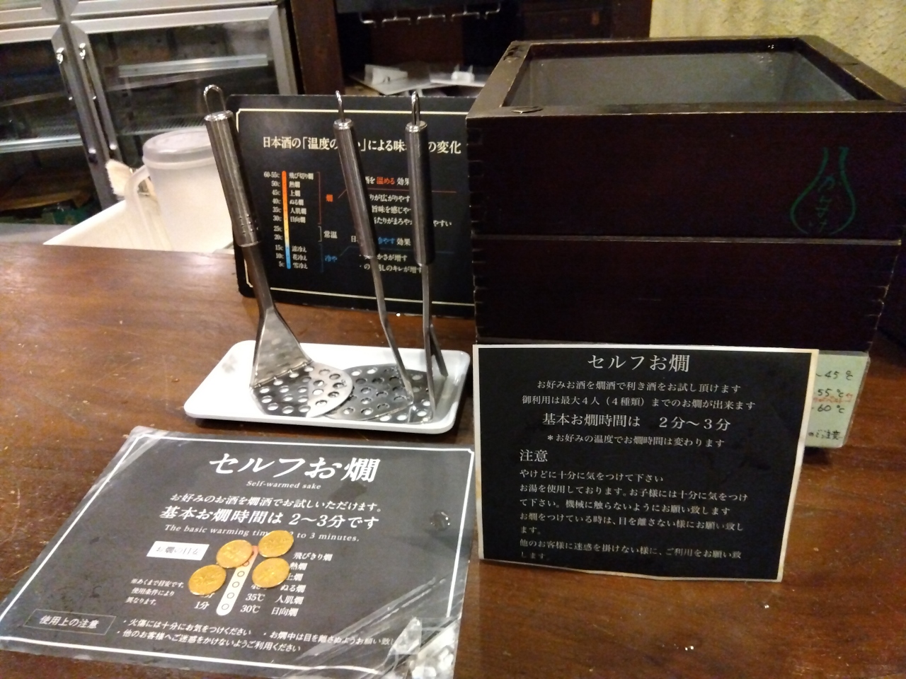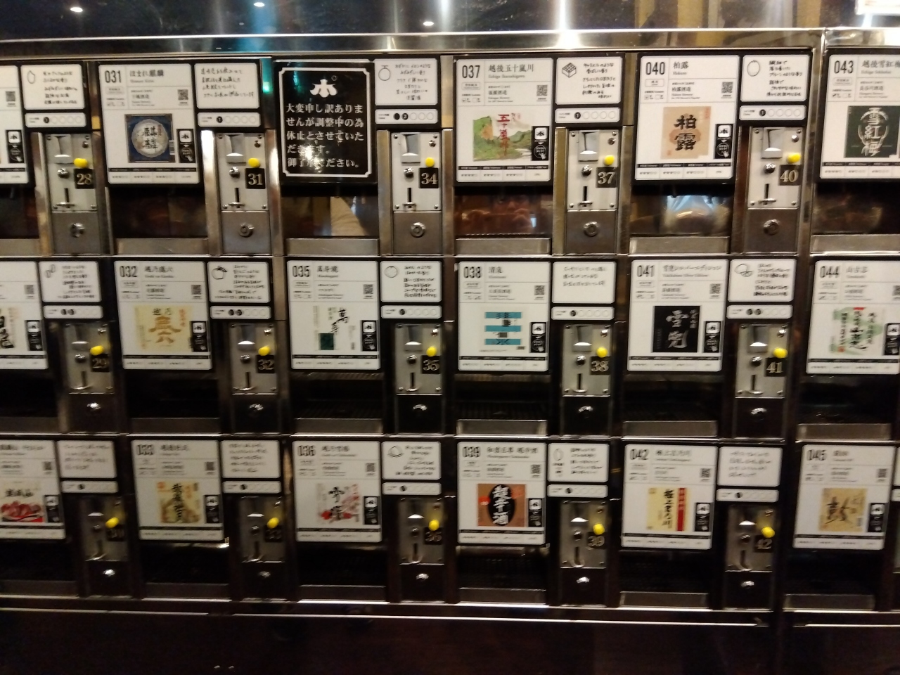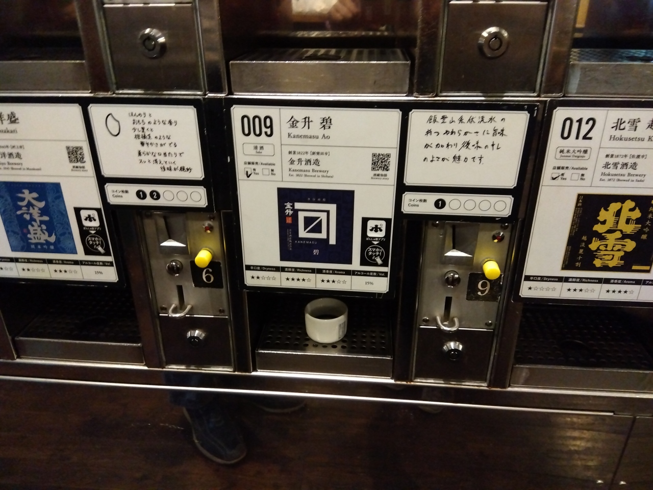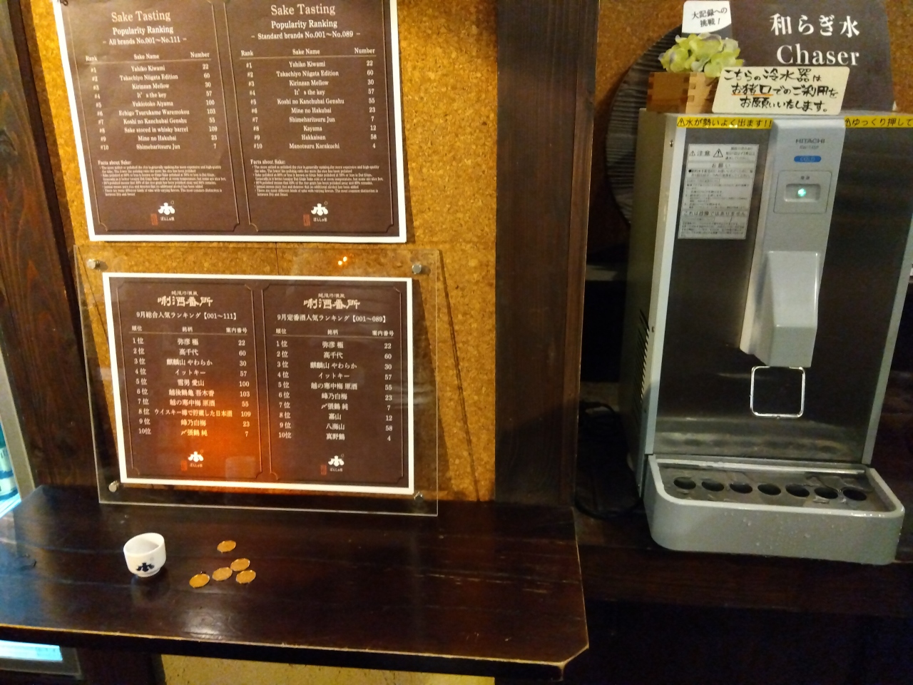レジで500円払い、おちょこ(返却)とコイン5枚と交換。マシンにおちょこを置いて、必要な枚数(通常は1枚、2・3枚もあり)のコインを入れて黄色のボタンを押すと日本酒が注がれます。