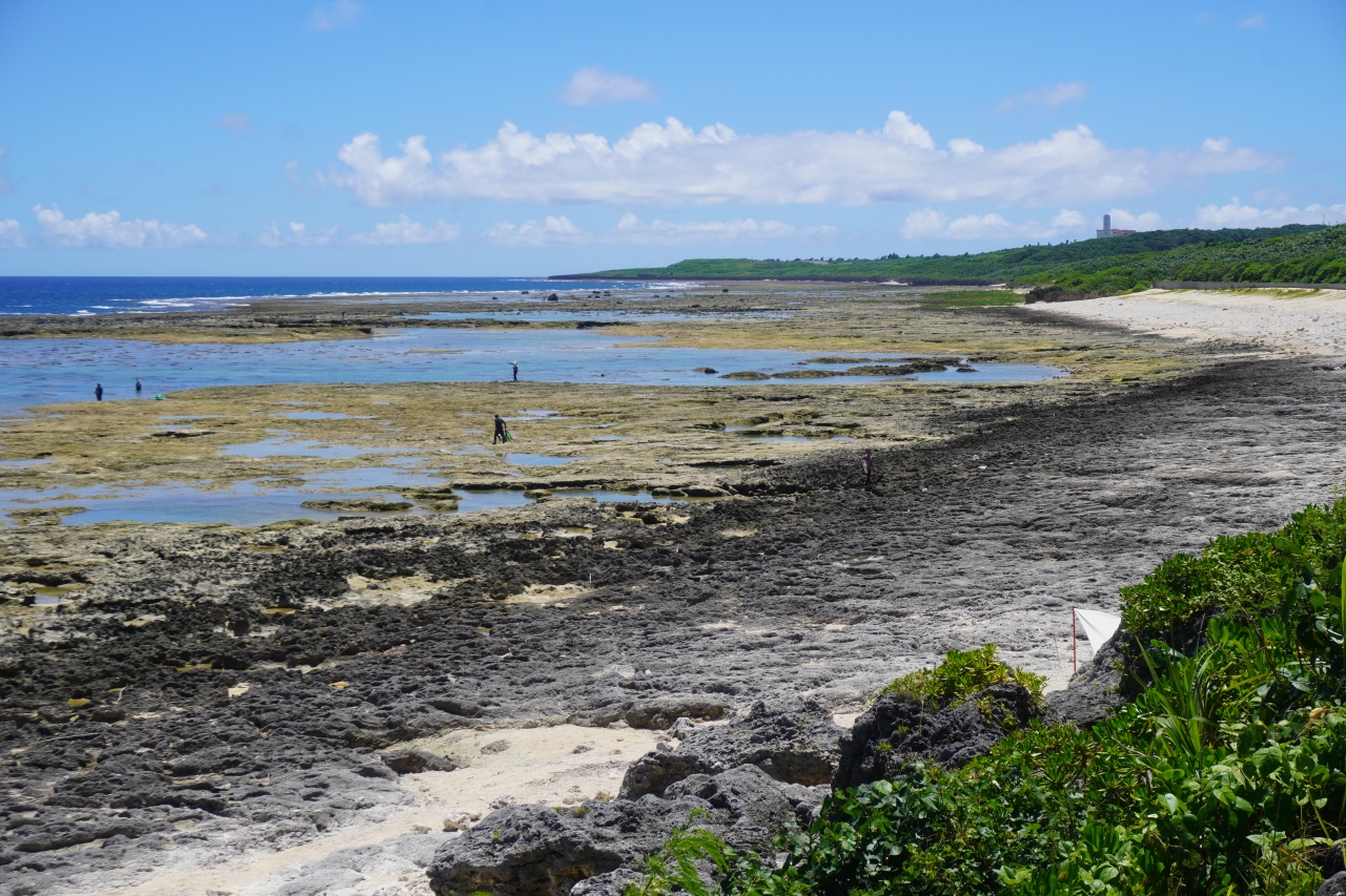 米須海岸は、大度浜海岸とつながる西側の海岸。大度浜海岸と同じく、サンゴ礁に囲まれた浅い海が広がる地形で、そのサンゴ礁の岩場を散策する人があちらこちらに。いわゆる磯遊びを楽しむところかな。波はもっと沖合に白く砕けているだけなので、岸から離れても全然平気。安全です。