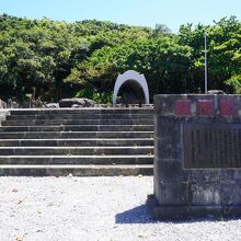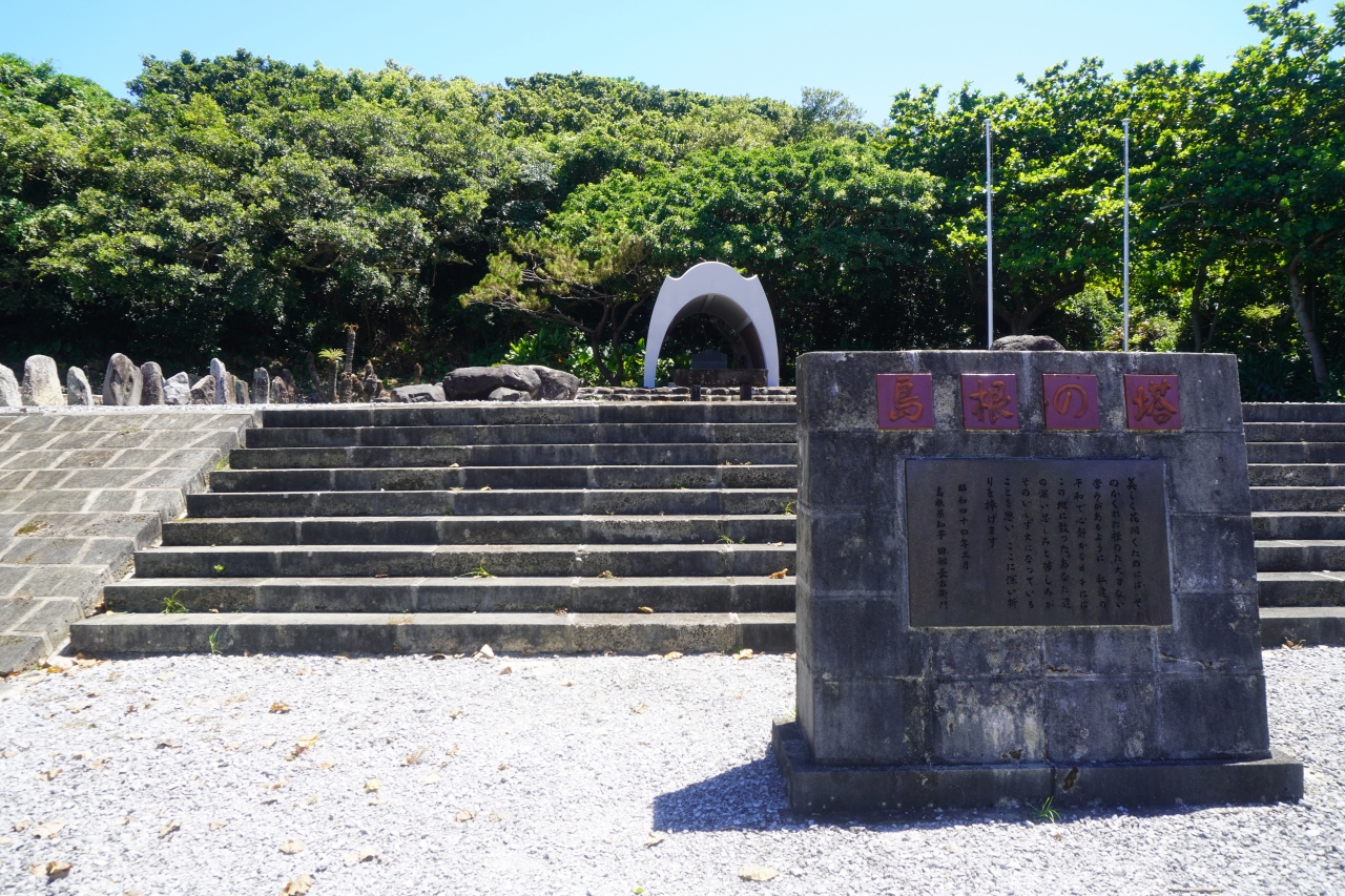 沖縄戦戦没者908柱を祀る慰霊塔。白いアーチ型のデザインはなんのモチーフなんでしょうね。手前の「島根の塔」の表示とのコラボが独特です。
