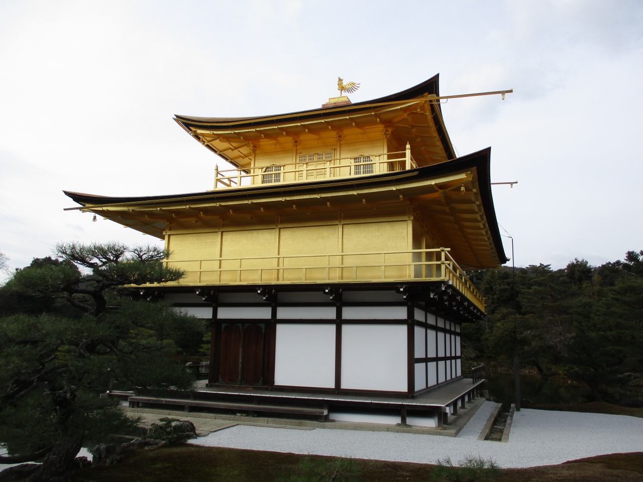 金閣寺は、2階、3階の部分に金箔が貼られていました。1階部分は手前の池にうまく金閣が映るようにするために貼ってないそうです。金箔は剥がすことなく貼り直すたびにどんどん厚くなっていくそうですきます。近くで見る金閣寺の輝きに驚きました。