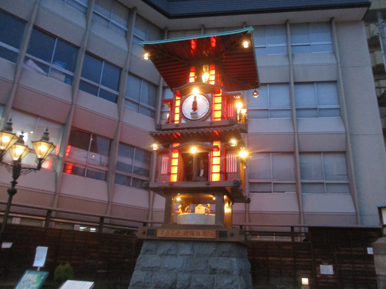松山駅付近のホテルに宿泊していましたが、夕方から道後温泉エリアに移動してきました。夜の放生園になるとからくり時計がライトアップされていました。時計の下にある足湯も継続して利用できました。21時くらいまで開放されているのが良かったです。