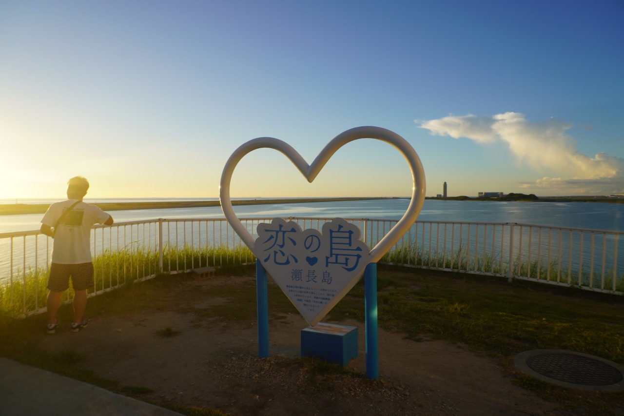 瀬長島ウミカジテラスは、那覇空港の飛行機の離発着や夕日の眺めを見ようと訪ねました。施設は海岸の方から山の方、高い場所まで続いているようですが、景色を見るなら上の方ですよね。恋の島瀬長島のハートのモニュメントがあって、そこから那覇空港の方を眺めました。しかし、想像していたより遠目。もうちょっと近くに見えるのかと思っていたので、ちょっと期待はずれだったかもしれません。