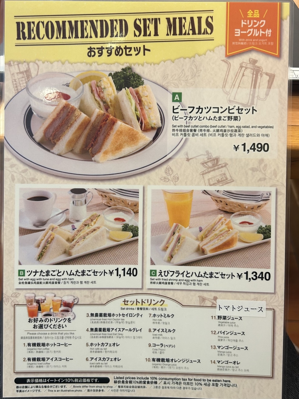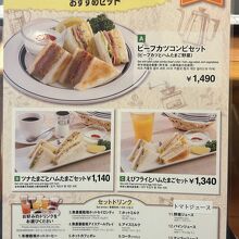 カツサンドやえびカツサンド、ハムサンドがあり、各種のセットもありました。