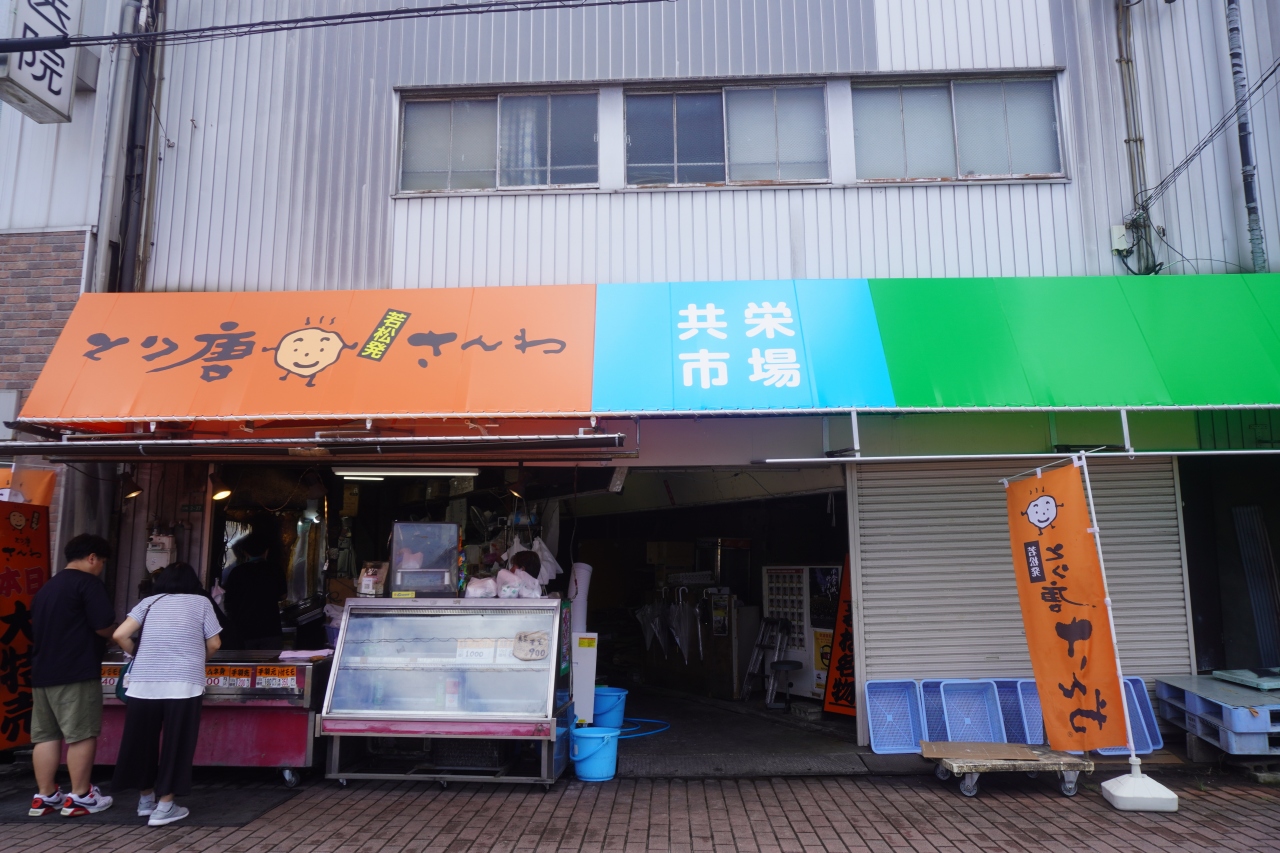 共栄市場は、あるにはあるのですが、中の方のお店はやっているようないないような。入口のところにから揚げ屋さんがあって、そこだけががんばっているような感じ。まあ、それだけでも良しとしないといけないのかな。近くには市場的な商店街、大正町商店街がありますので。