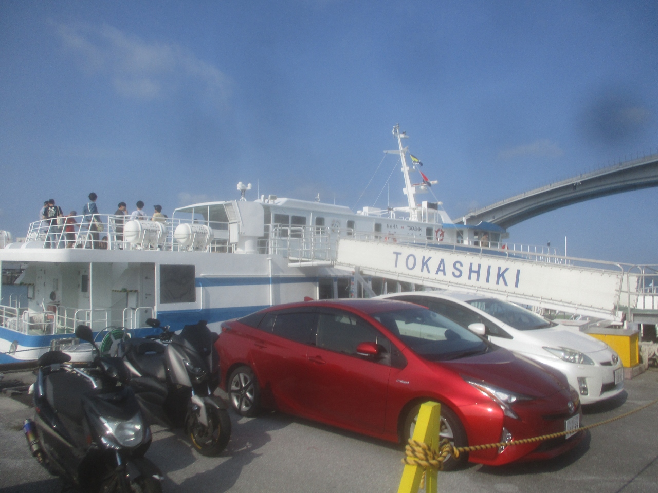 泊ふ頭旅客ターミナルビルの入口にかかっている長い橋です。橋の下をフェリーが行き来するので、高さも結構ありました。泊大橋をくぐって往来するフェリーをのんびり眺めるのもいいもので、このツーショットは絵になる風景だと思いました。