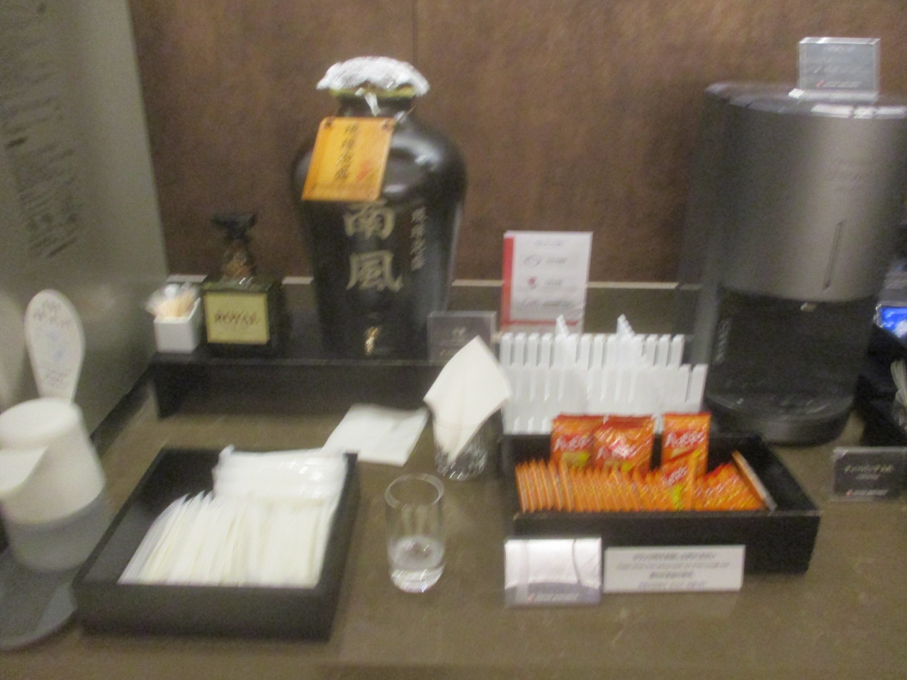 国内のサクララウンジには通常各社のビールサーバーが並んでいます。那覇空港のサクララウンジのサーバーは2台ともオリオンビールのみでした。やはり、沖縄に来たらオリオンでしょう。アルコール度数の高い泡盛が隅の方に置いてありました。