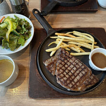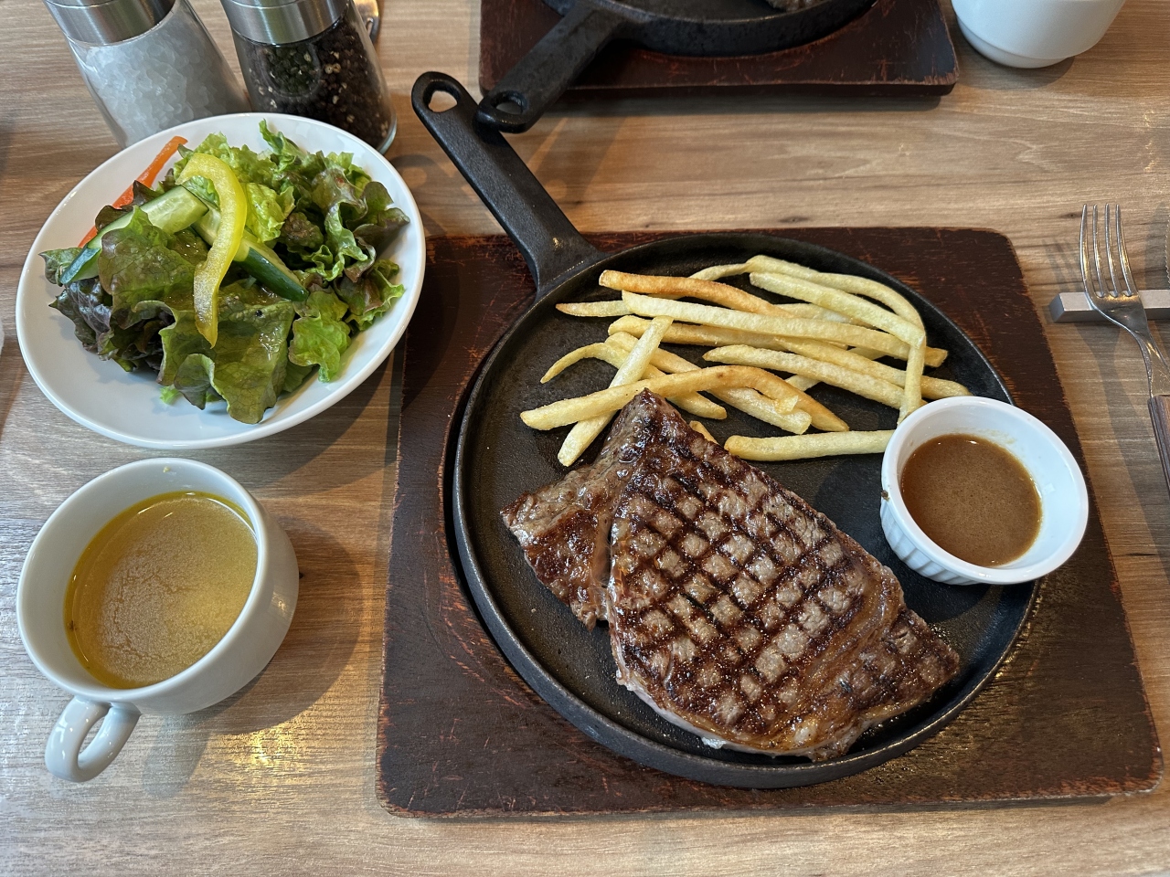 和牛切落ステーキを頼みましたが、お肉が本当にジューシーでおいしかったです。150グラムで1,600円でした。プラス800円でビュッフェセットがつけられるので悩みましたが、ビュッフェをつけなくても、お肉とスープとサラダでおなかいっぱいになりました。お店はビルの10階にありますが、窓から街並みが見えて、よかったです。店内の雰囲気もちょっと高級感があってよかったです。