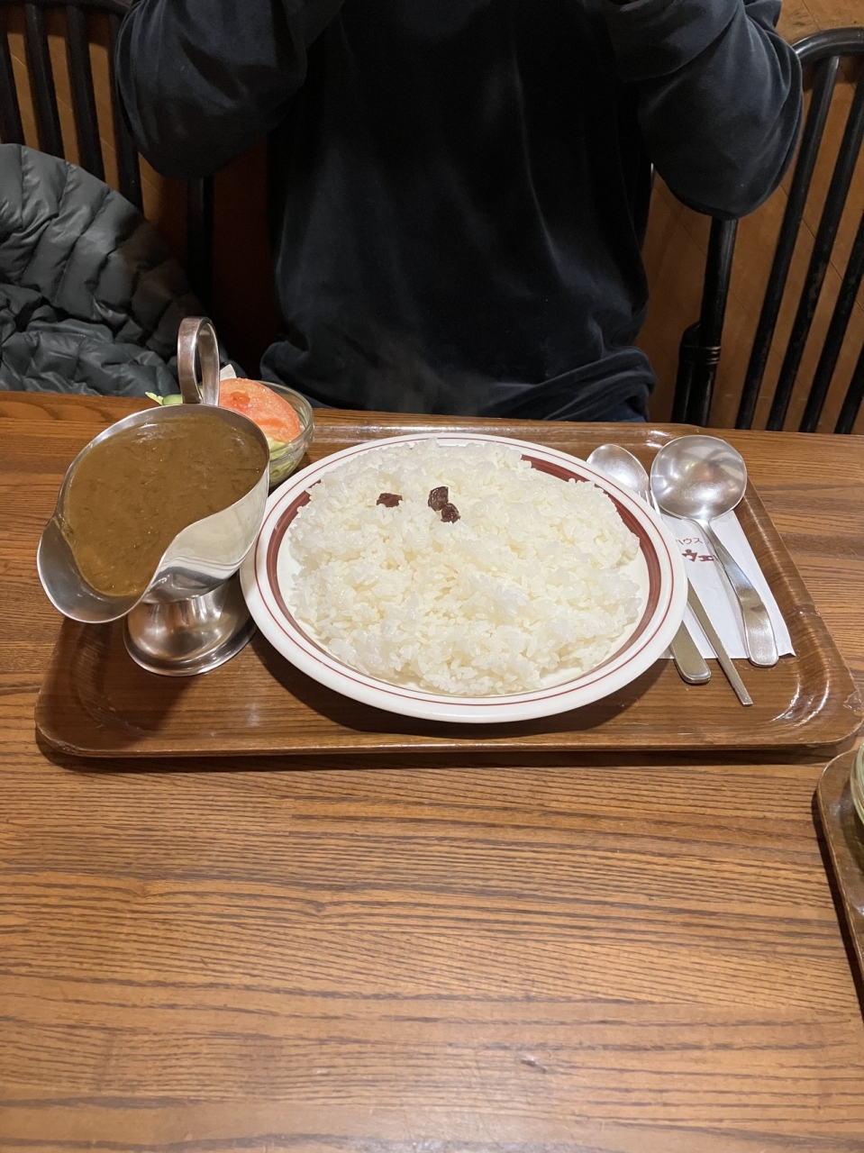 20年以上ぶりに訪問。前に行った時は夕方だったと思うが今回は開店一巡目を狙って行きました。10時54分お店の前には1組おり店員さんから並ぶ方向を指示され待ちました。並んでる間店員さんは窓ふきしたりお掃除されてました。11時15分位に席に案内。後払い、現金のみ。チーズの小、相方はビーフの普通を注文。ご飯は小が300g、普通が550g、価格は30円差。カレーのみだと飽きてくるので机にある福神漬け等トッピングしました。チーズでも辛めだったから次回はハヤシにします。