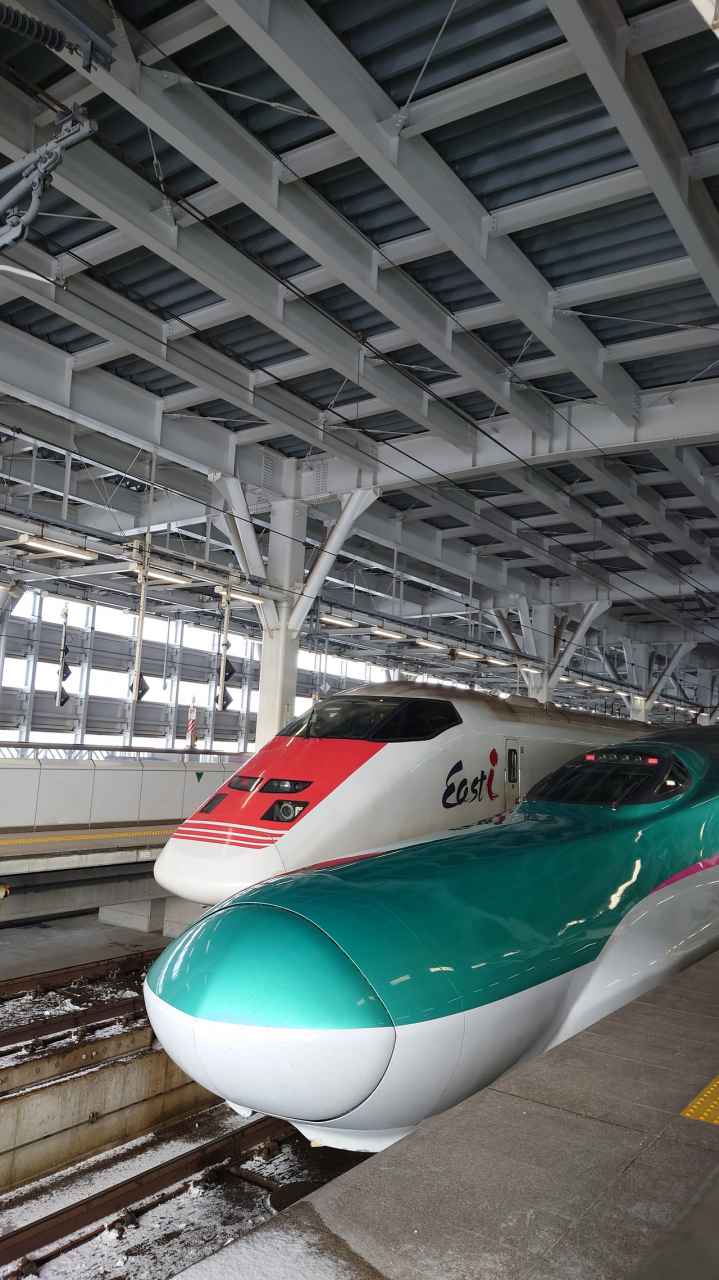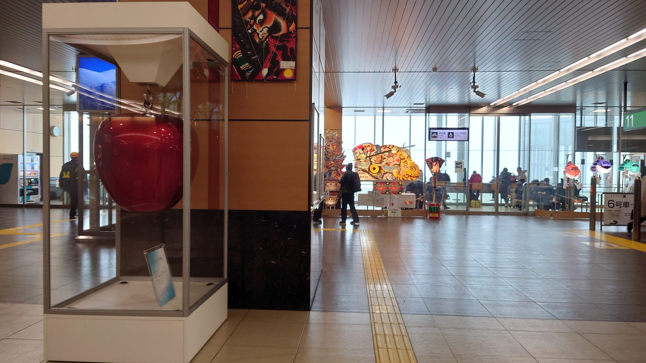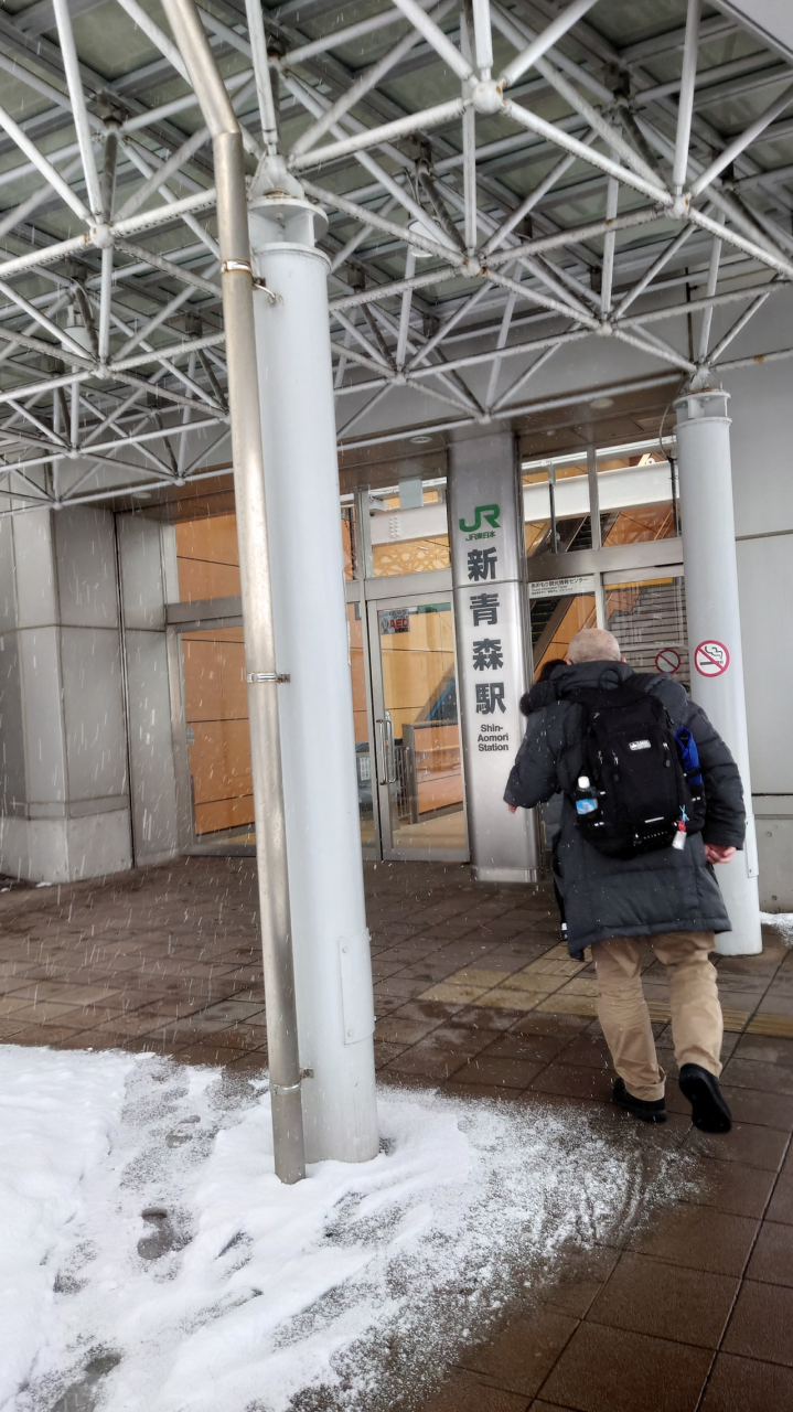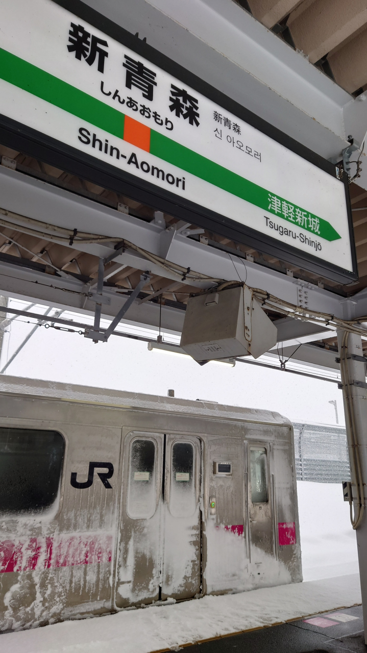 ちょうど、雪の多い頃でしたが、盛岡あたりまではほとんど雪も積もっていなかった。新青森に着いた時は吹雪でした。駅舎の窓から外を見ると真っ白。新幹線構内はよく聞いていたねぶたのミニモニュメントや新幹線のマッサージ機があり、ゆっくり見たかったが大雪で電車が走っているか心配でホームに急いだ。線路には雪が積もり、果たして青森駅に行く電車は来るのか。新青森はとにかく青森駅まで行かないと始まらない。大幅に遅れている電車も雪だるまの様になってホームに入る姿は壮観で逞しい。新青森から青森間は普通乗車券で特急に乗る事ができる。大幅に遅れていた特急つがるに乗る事ができた。帰りは流石のこの電車達も走る事ができないほど雪は更に降り積もり、バスで新青森まで来た。雪が少ない地域から来る者には逞しい雪国の駅、電車だった。