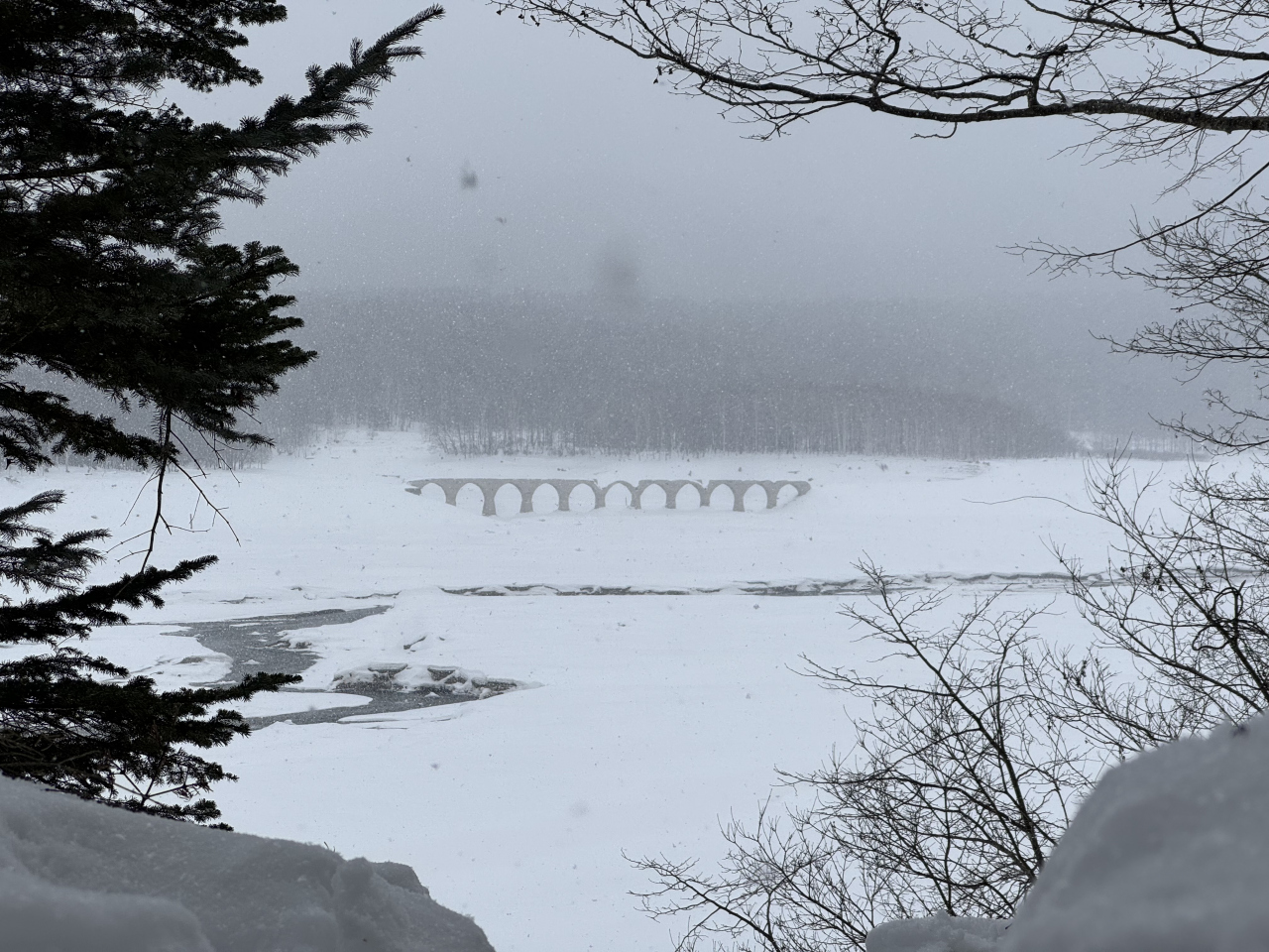 冬季、橋梁まで近づく湖上ツアーが行われていない時は、基本、対岸あるタウシュベツ展望台からその全景を見ることになります。