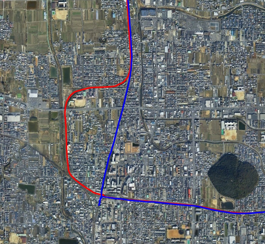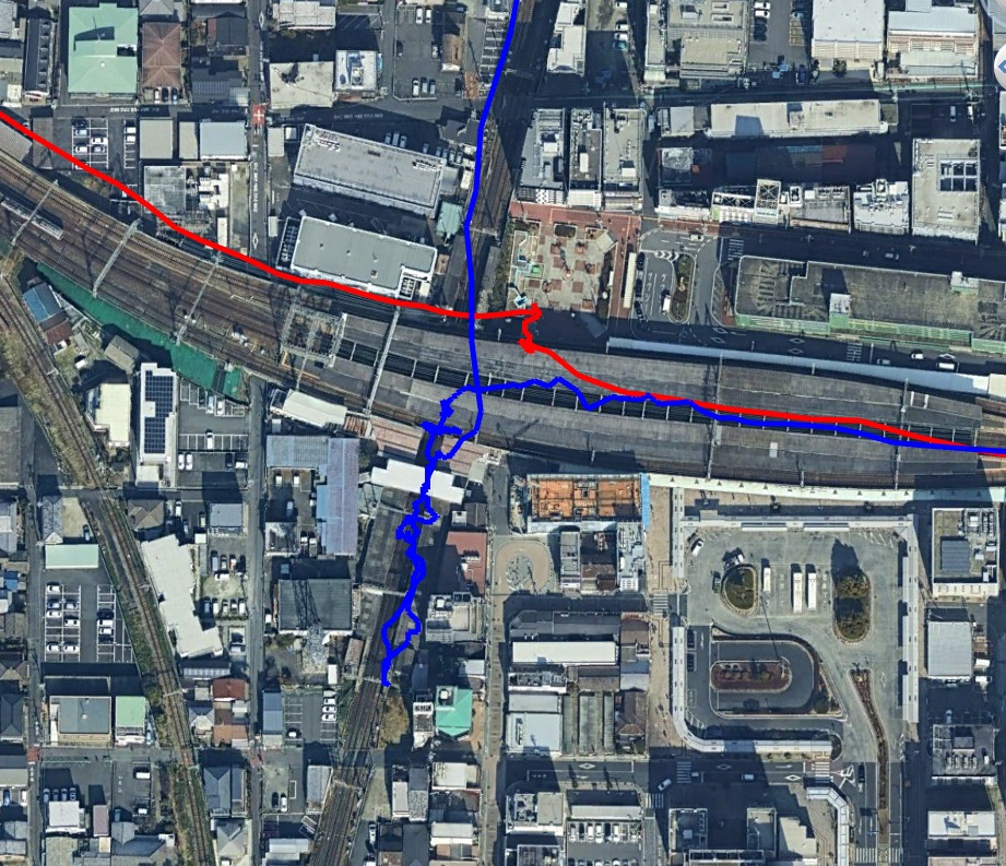 近鉄の大和八木駅は線路が十字に交差しています。それなのに、京都ー鳥羽直通が運転できます。不思議だと思いませんか。名古屋から京都にいくには、階段をおりて、十字に交わるべつの路線の電車に乗ります。でも、京都から名古屋にいくときは、ホームの向かい側の電車に乗ればいい。不思議です。その理由がgpsの軌跡をみてやっとわかりました。京都ー鳥羽線は迂回する別の線路をはしっているのです。近鉄さん、ご苦労様です。