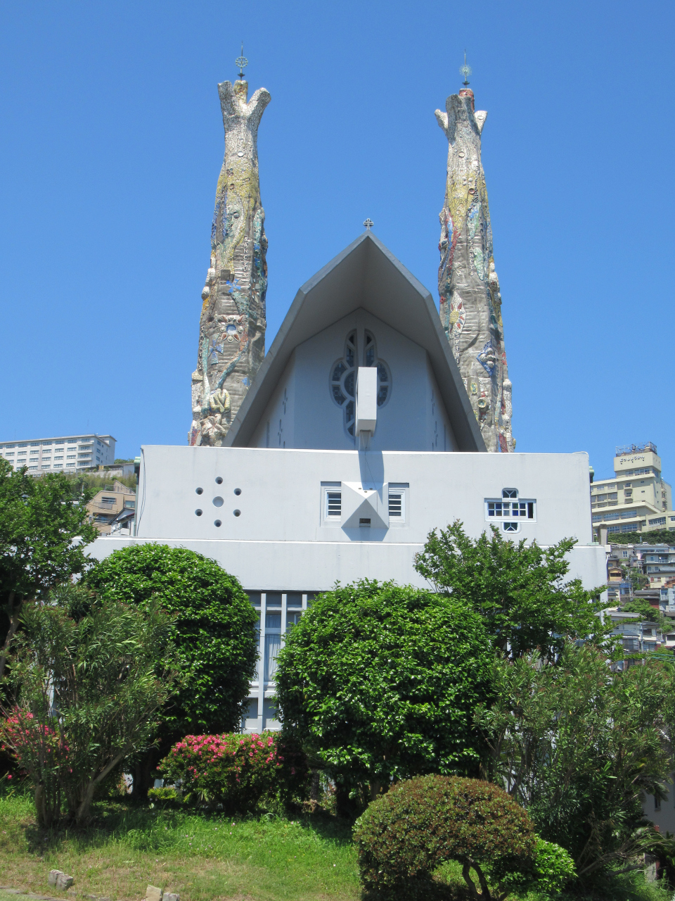 日本二十六聖人殉教地の碑がある広場から、芸術的な双塔が目をひきます。1962年に建立した聖フィリッポ教会です。二十六聖人の外国人六人のうちの一人、フェリペ・デ・ヘススから名前はきています。フィリピンで司祭になるための勉強を終え、祖国メキシコへ帰る途中、座礁した船に乗っていたために捕らえられ、他の二十五人と共に殉教者となりました。メキシコから寄せられた寄付を基に、ガウディ研究者の建築家今井兼次の設計に寄り聖フィリッポ教会が建てられました。陶片モザイクがはめ込まれている塔はガウディを連想させる芸術的なものでした。時間がなければ外観だけでも見ることをおすすめします。