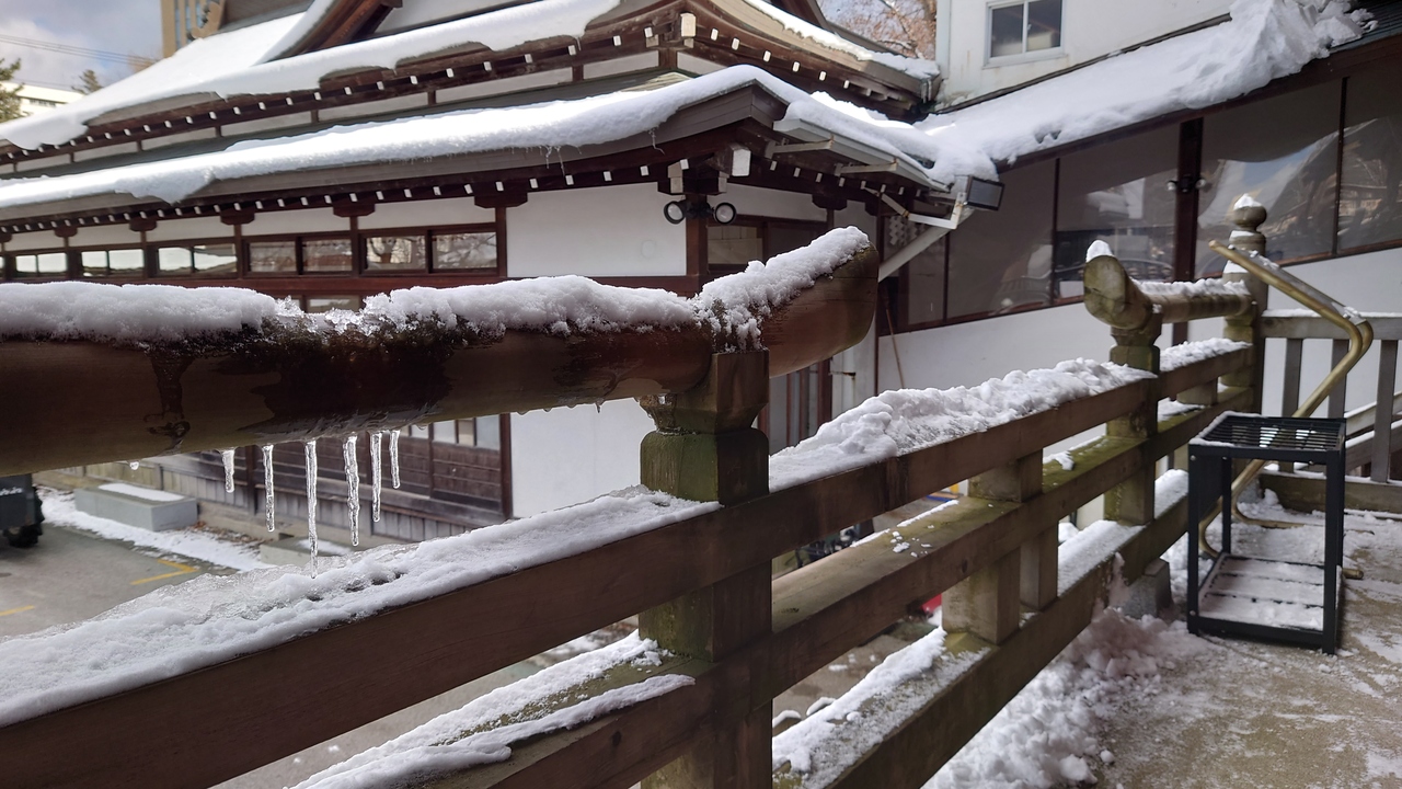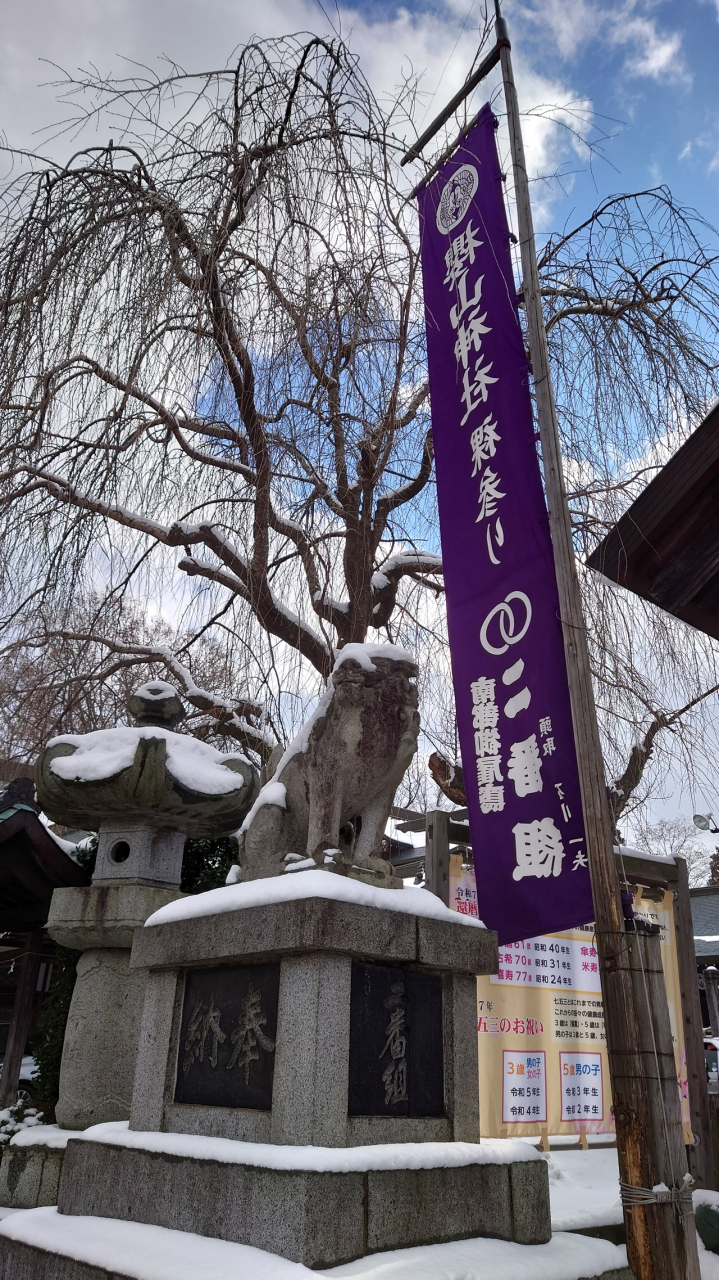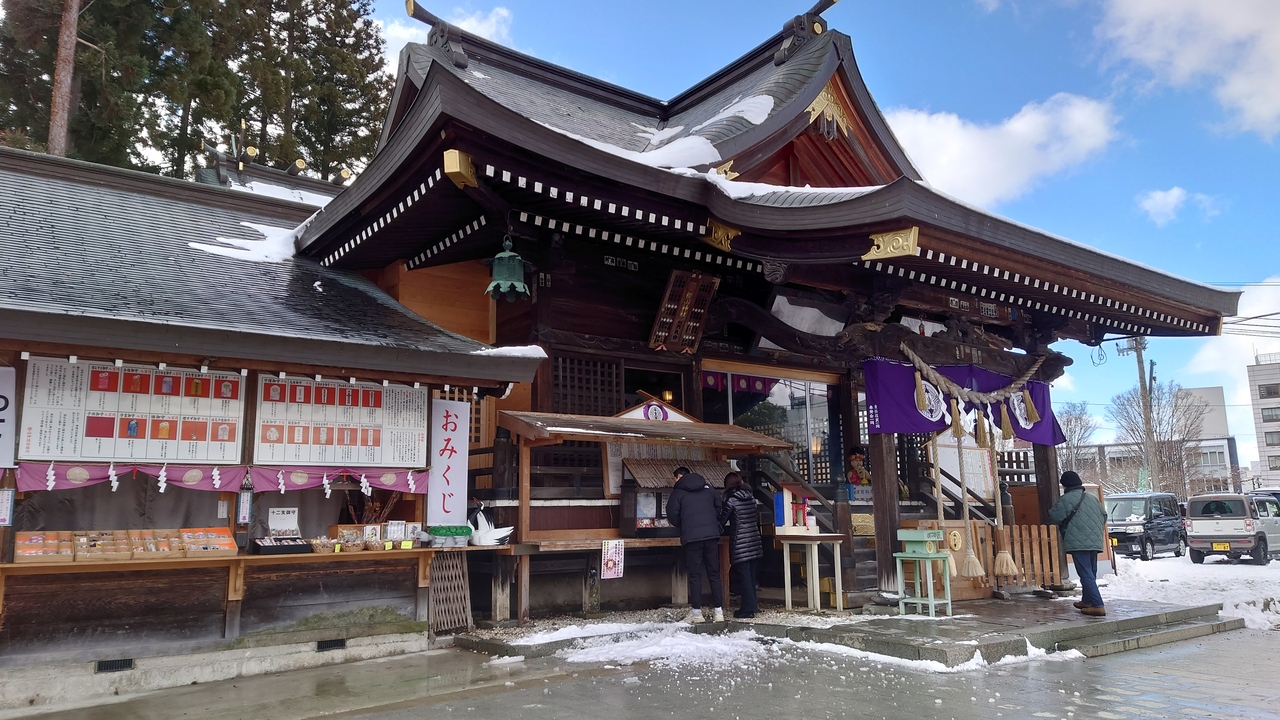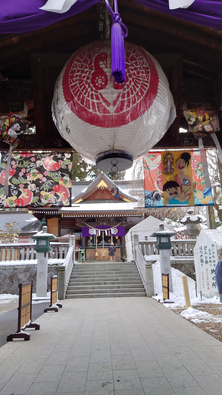 盛岡の大通りアーケードを抜けると盛岡城址公園に出て目の前が広く広がります。季節には桜も美しく、すぐ桜山神社が見えます。大変立派な華やかな神社で裸祭が有名だそうです。立派な狛犬の間を通り楼門の下には鶴の向かい絵が描かれた大きな提灯。華やかな絵やマコトちゃんの絵が飾ってあったり華やかな印象があります。雪景色の中でいっそう明るい感じがしてステキな神社でした。