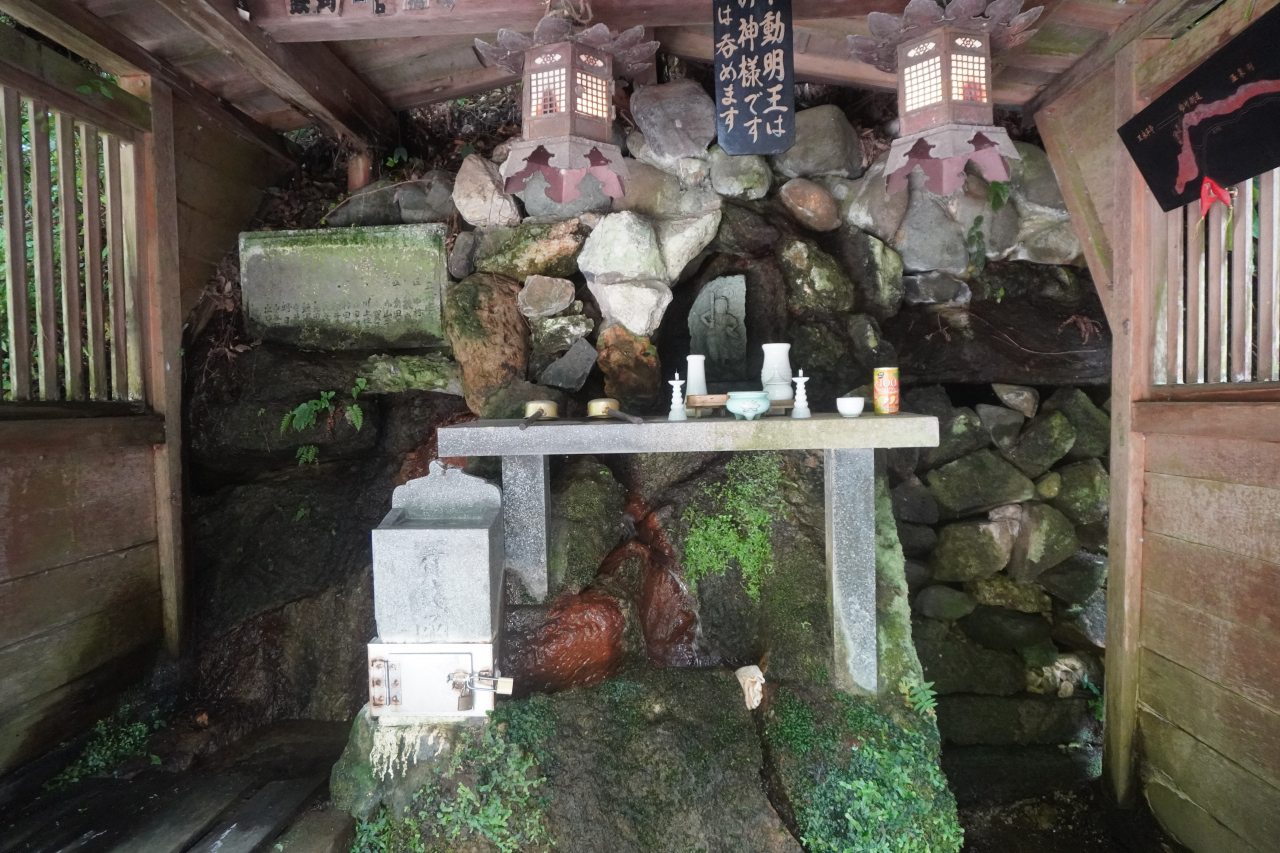 岩不動は、こおろぎ橋の北側すぐにある小さなお不動さん。小さな祠の中を覗くと苔むした岩の間から湧き水が湧いていて、ひしゃくが置いてあって飲むこともできると書いてありました。まあ、そんな雰囲気ではないんですが、そのようです。