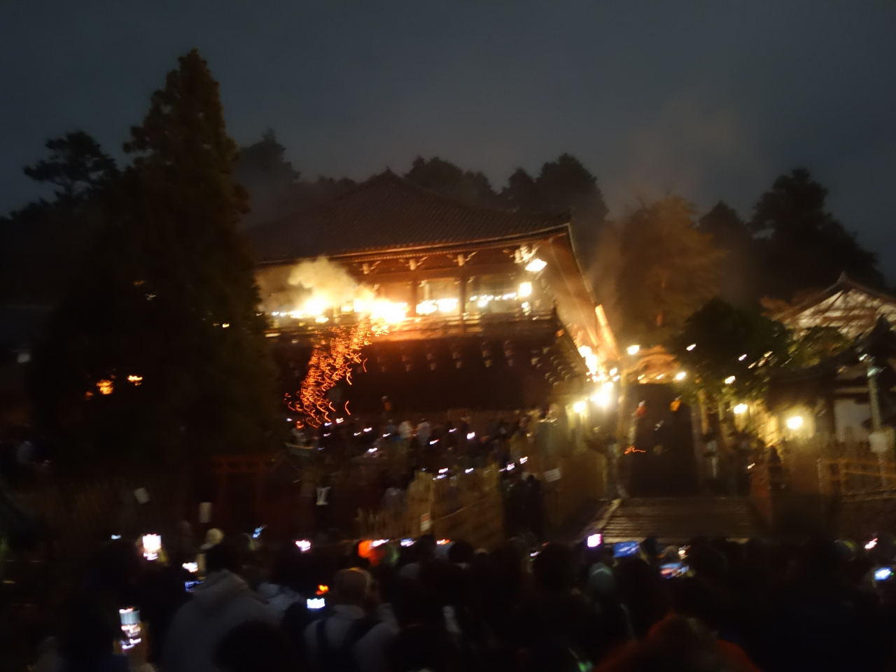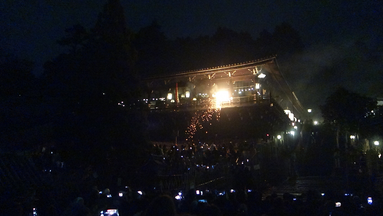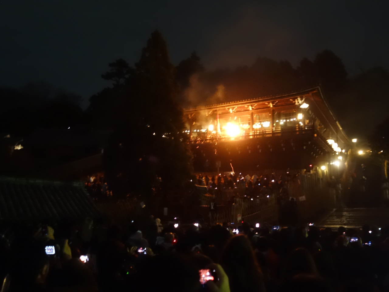 「お松明」がよくニュースで見る二月堂の欄干を松明をもって走る行事です。10本か11本(12日)の松明が燃やされます。