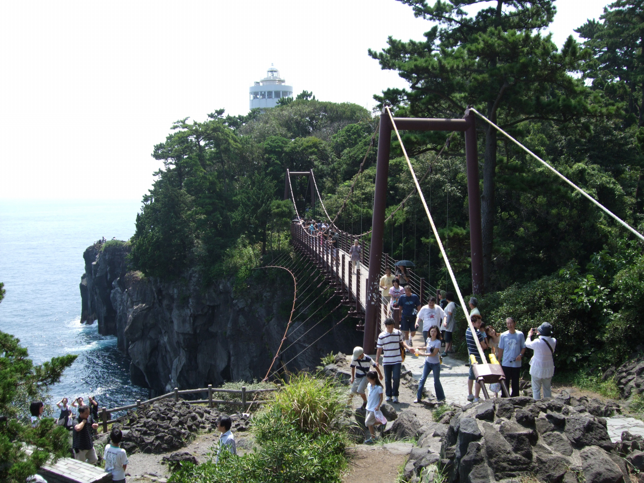 門脇つり橋は、城ヶ崎ピクニカルコースのハイライト。岩場の海岸にあって、ここを渡ると間もなく門脇灯台に至ります。ピンと張りつめたケーブルが左右に広がっていて、しっかり橋を固定している感じ。これで揺れも少なくなっているのかなあと思います。