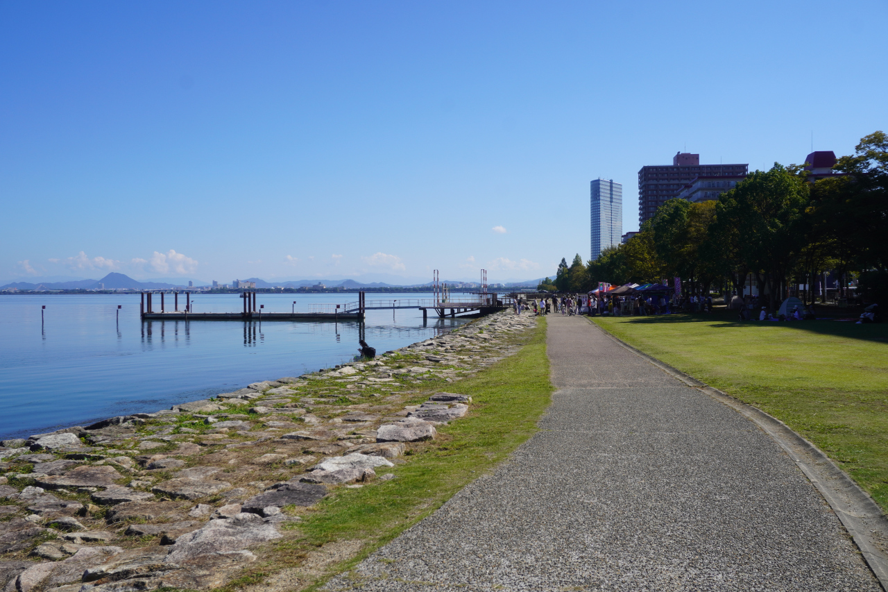 びわ湖ホールの裏手、琵琶湖の方に出ると、湖岸を東に向かって延びる遊歩道があって、それがなぎさのプロムナード。歩いている人や自転車に乗っている人もいて、思い思い。長閑な景色を眺めながら、開放感のある遊歩道の雰囲気を楽しんでいました。