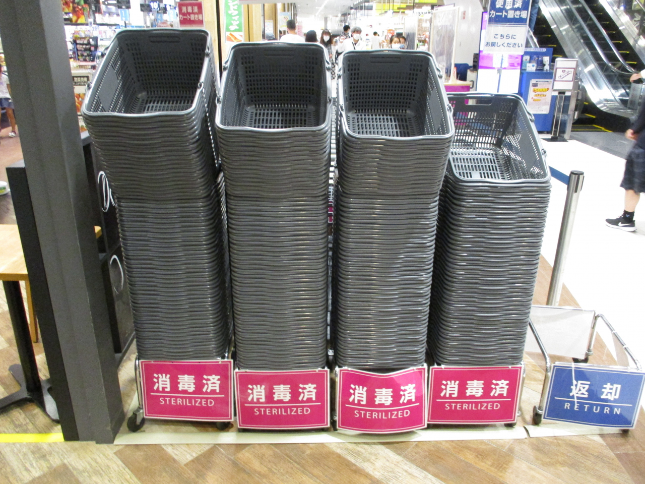 イオンモール旭川駅前のショッピングかごは除菌して消毒済と使用済み返却で分けて置かれていました。新型コロナウィルス感染対策の一環と考えますが、スタッフの方たちが、使用済みのかごをひとつひとつ拭いて消毒済にしているのかと思うと、きっと大変な作業なのだろうと想像してしまいました。