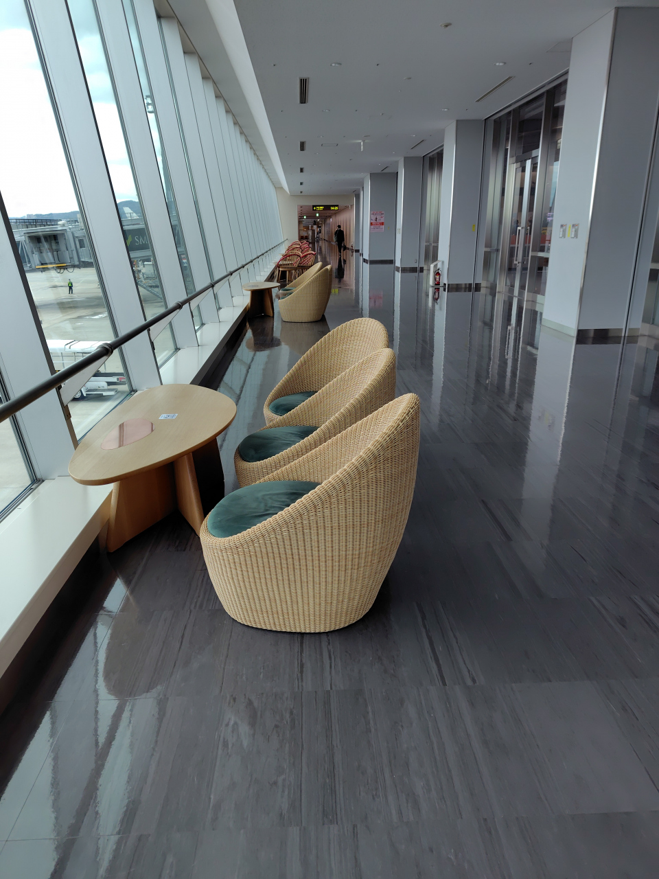 その通路は滑走路側に大きな窓があり、テーブルとソファがあって、ゆったりした空間です。