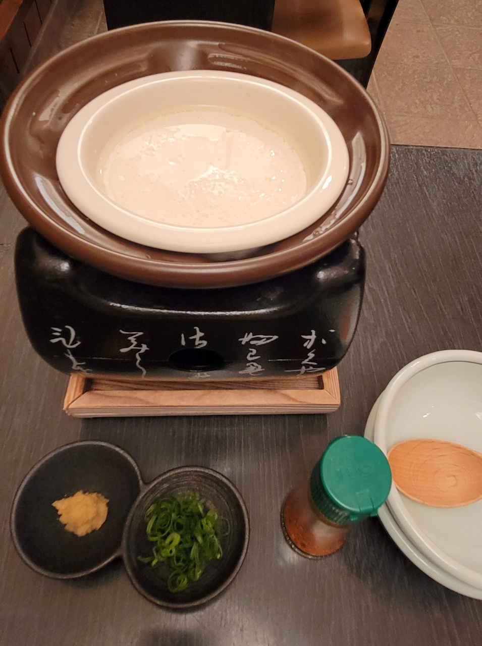 北海道産大豆のトヨマサリで作られたお豆腐を、テーブルの上のコンロで温めて熱々でいただきます。