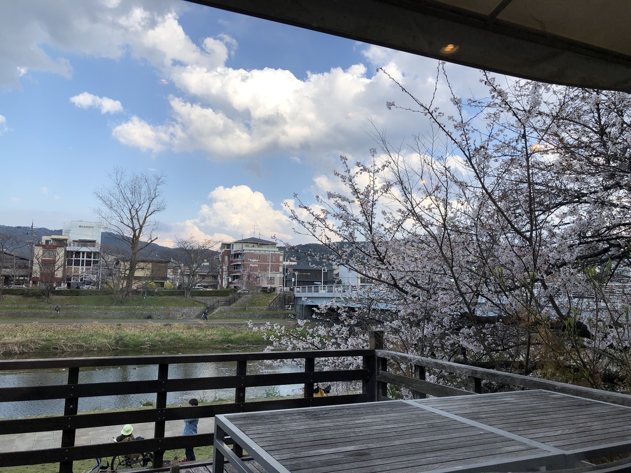 奥は鴨川沿いになっていて、ちょうど桜が満開の時期でとても雰囲気がよかったです。