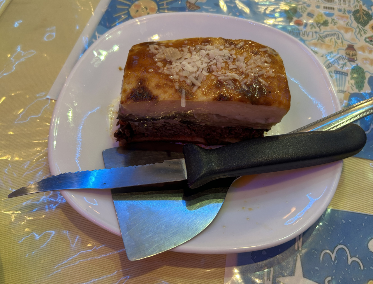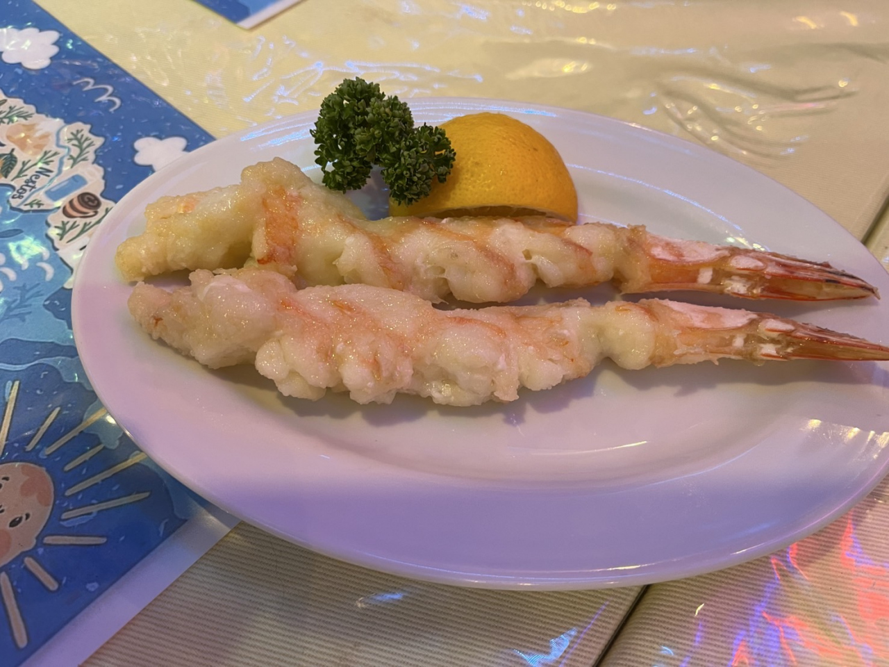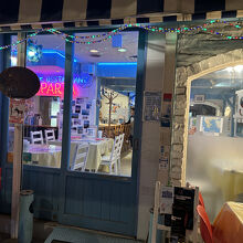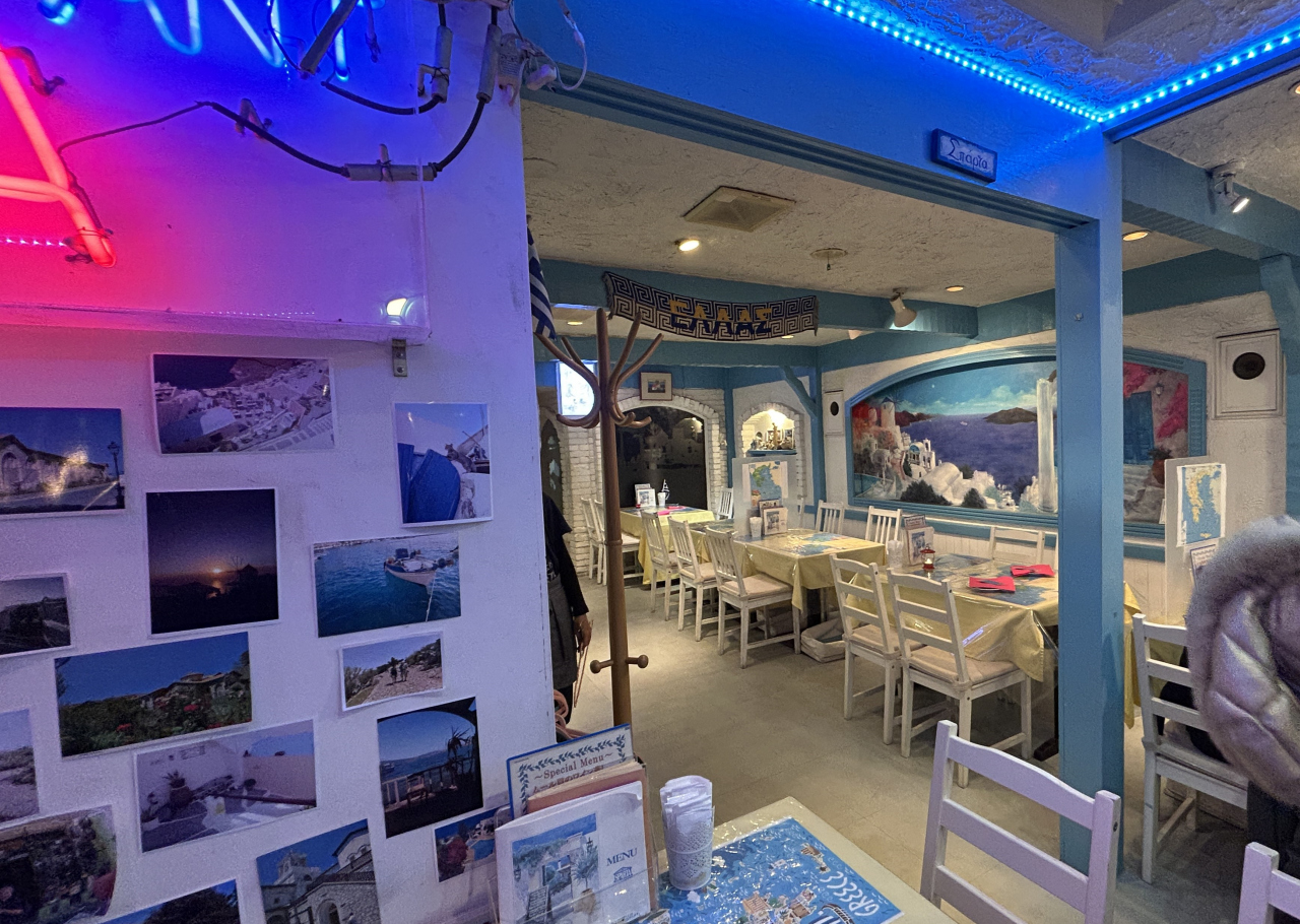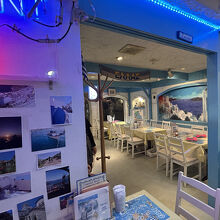 店内は白い壁にブルーの柱、エーゲ海のイメージでしょうか?ただ夜だったこともあり電飾を含め明るいというより安っぽい雰囲気。予約してなかったら行かなかったかも?おまけにそんなにリーズナブルではない・・という事で一人一品ずつで3品をオーダーしてシェアしていただきました。