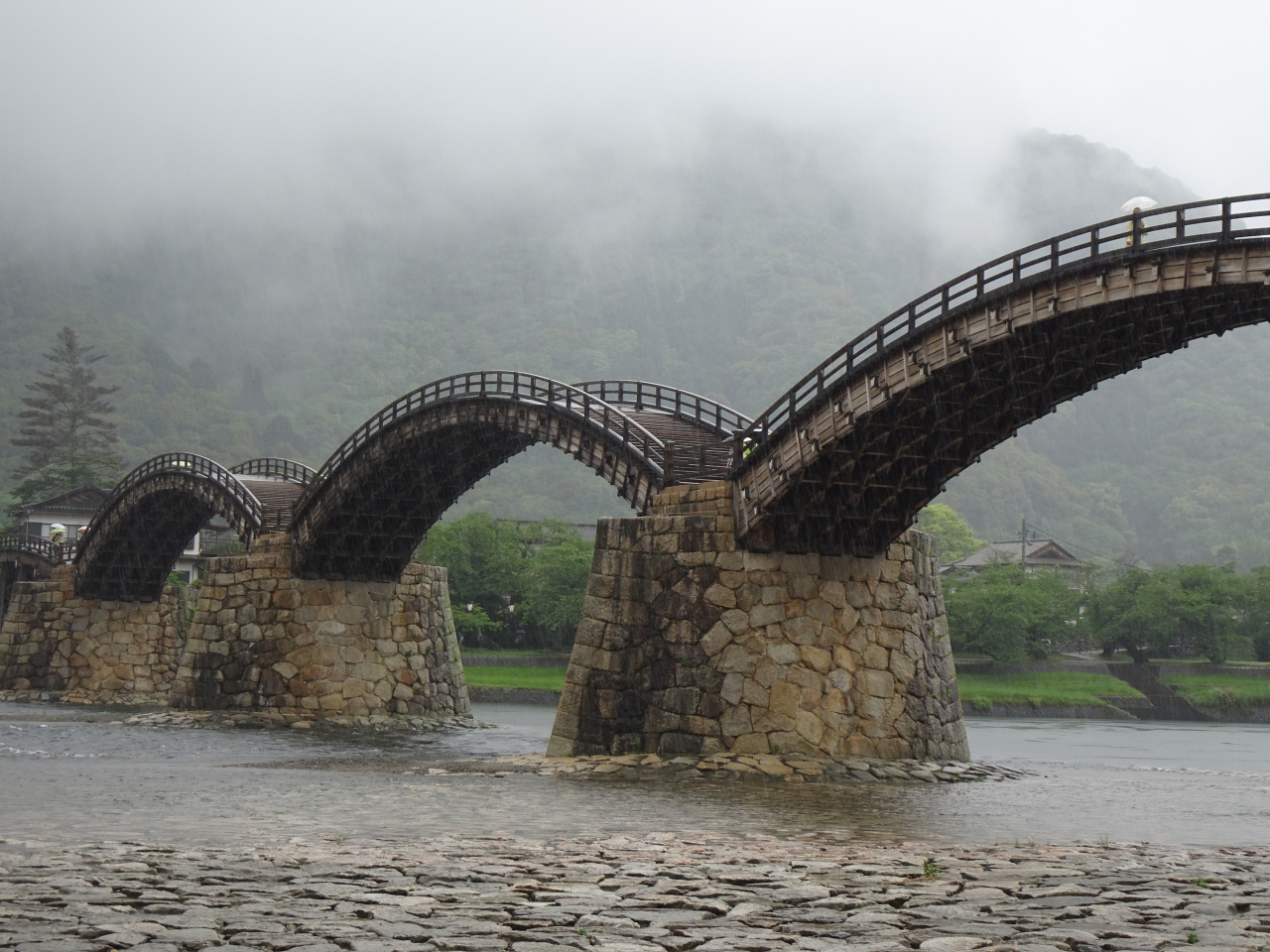 大雨の見学でしたが、人も少なくて後ろの山も雨でけむり、なかなか風情のある姿を見せています。5連のアーチが美しい木造の橋は組木の技術で釘を1本も使わず造られているそうです。木でできているので雨は滑りやすく、慎重に渡りましょう。
