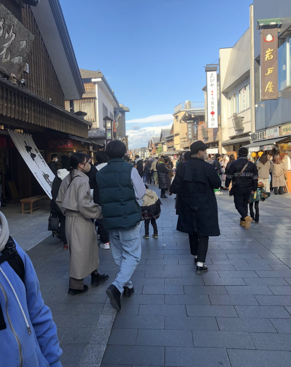 土産物屋と飲食店が軒を連ねるが、食べ歩きの店も多く、大抵の観光客は手に食べ物を持っている。