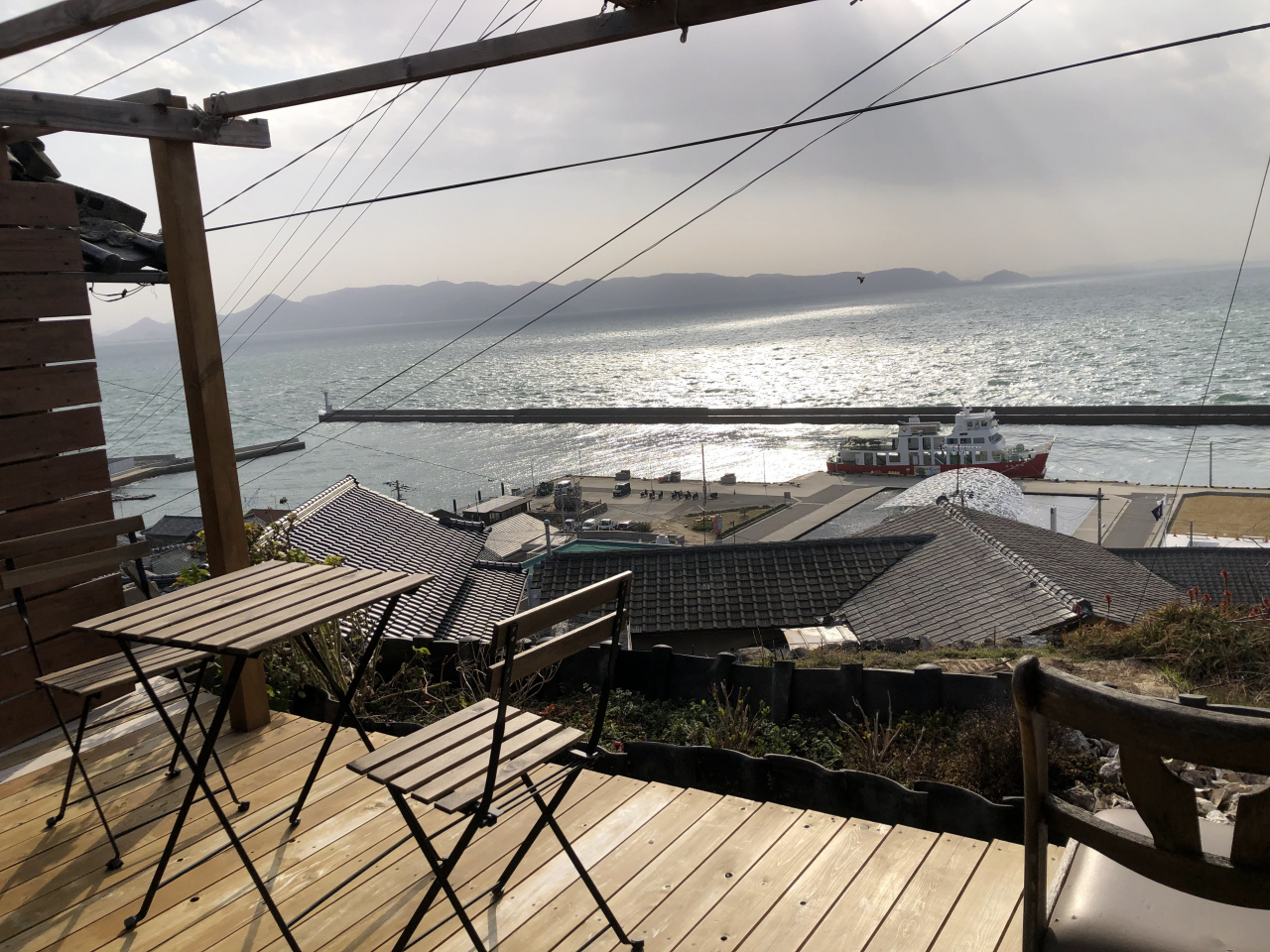 海に向かったテラスはちょうど男木島の港の上に位置し、眺めがとてもよい。