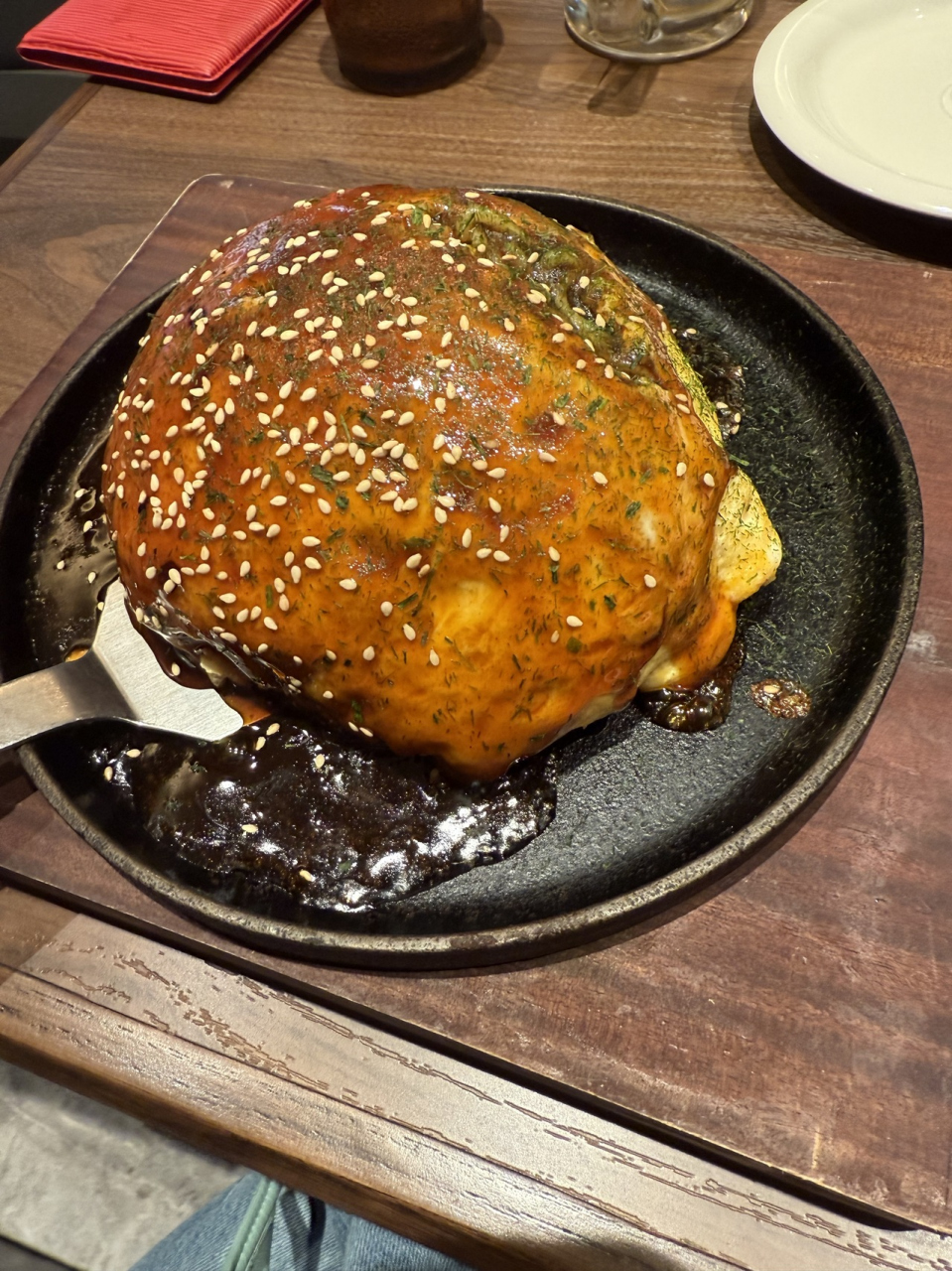 値段と写真からもう少し小さい物を想像していました。来たものは想像上に大きく、お腹に溜まります。卵がフワフワで子供が全部たべました!麺は細めなのかな。野菜と殆ど同じか細めなので野菜が邪魔をしないで食べられました。焼きそばだけも欲しいです。ドリンク高い。年齢を聞かれず、子供もワンドリンク制と言われたので子供と2人でしたがお好み焼きも2つ注文し、食べられなかったので1つはテイクアウトしました。