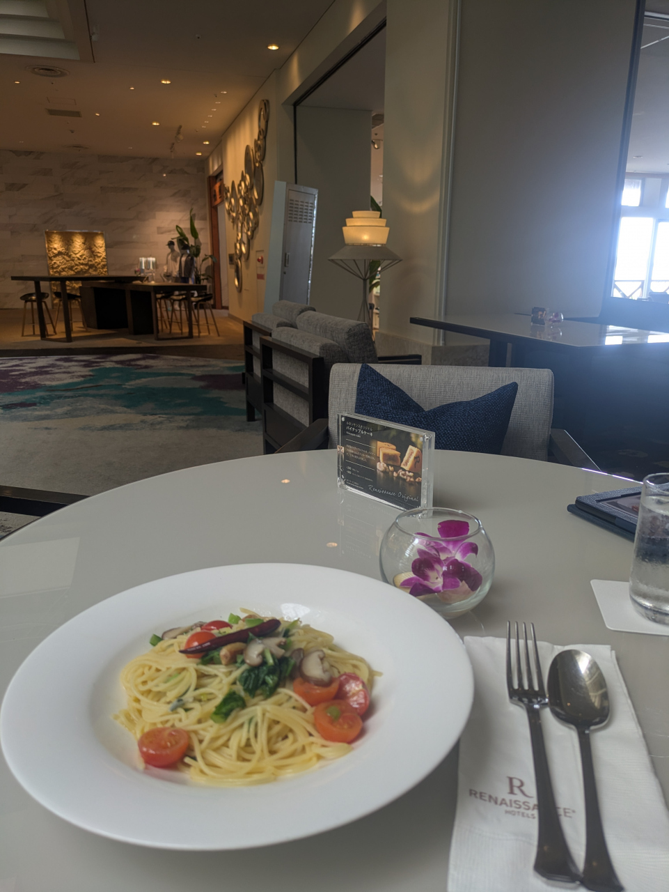 他のレストランはビュッフェなので、そこまで食べられないと思い、ロビーラウンジへ。クラブハウスサンドなどいくつかメニューがありましたが、パスタをチョイス。ロビーラウンジは天井が高くて座席も広々しているので、ゆったり過ごせるところが利点だと思います。今回はグループホテルの「ココガーデンリゾート」に滞在していましたが、いわゆる大きなホテルのロビーラウンジで寛ぎたい時は「ルネッサンス」を利用するのもありだと思いました。