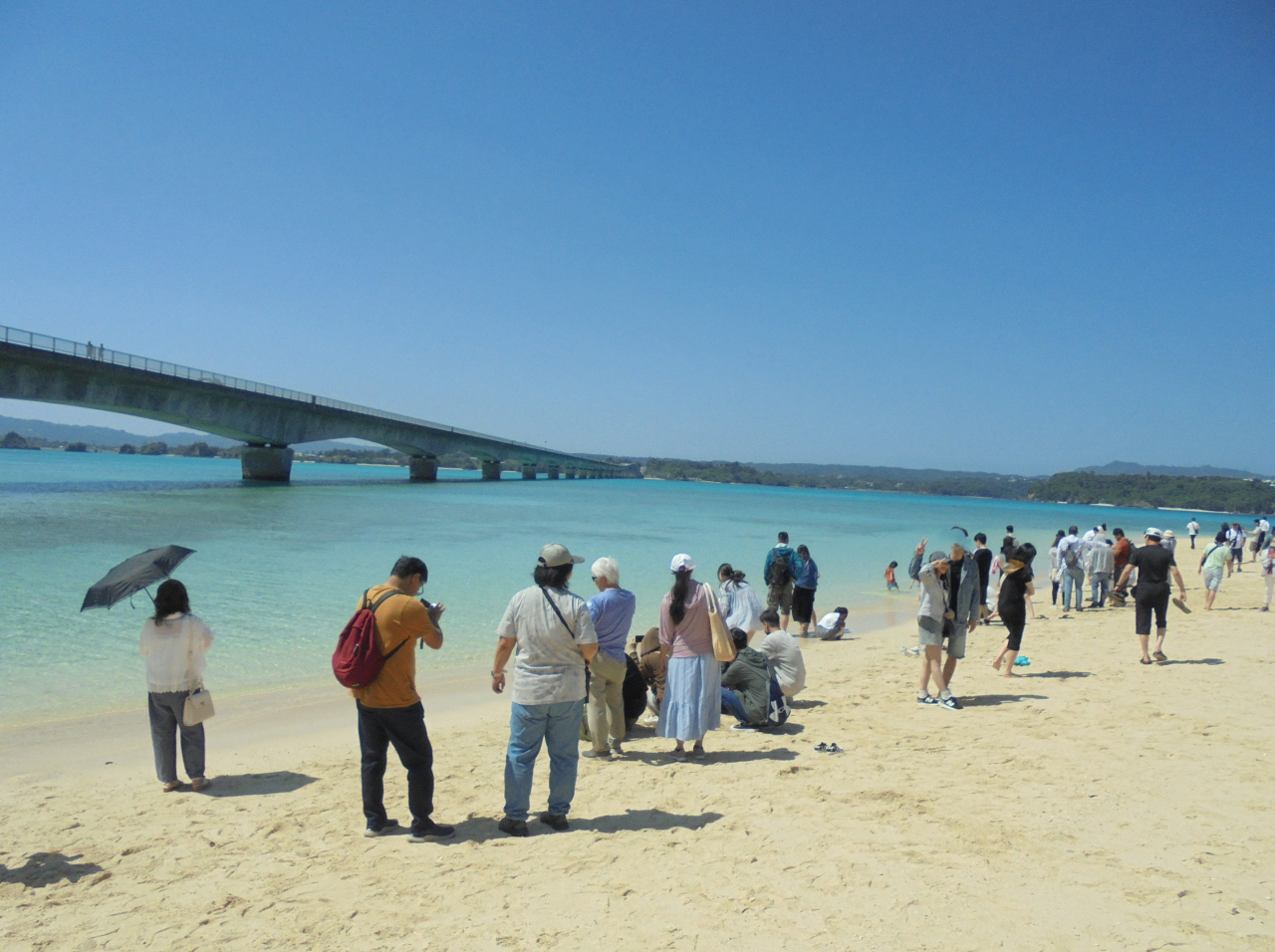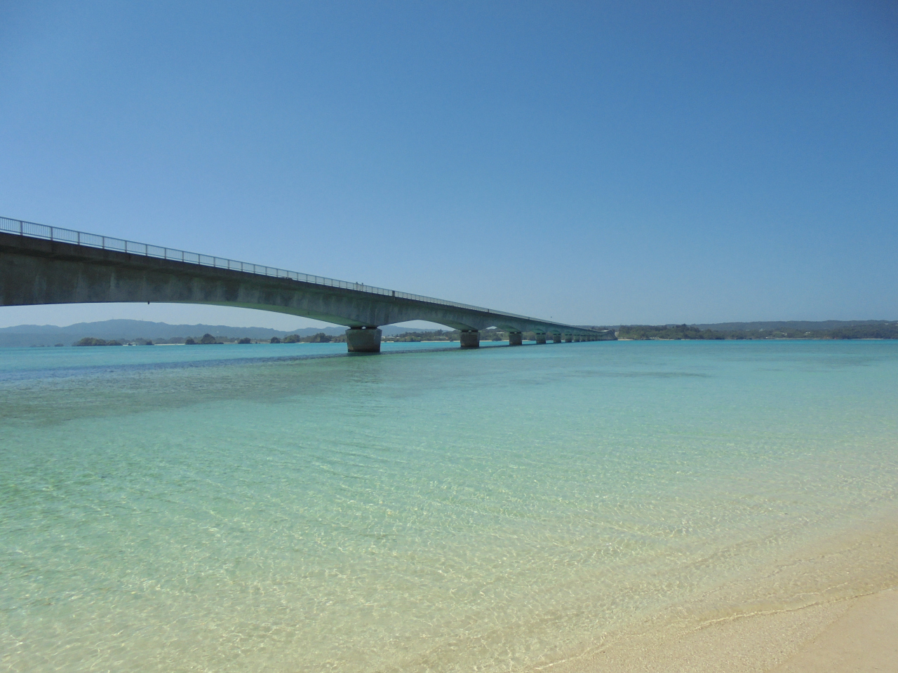 古宇利島の駅そらはしから公園を通って広い砂浜へ出られます。砂浜から左手に大橋、前面にブルーが七色に見える海が広がります。大橋はずっと奥の陸へと続くので、青い海の広がりが一層強調されます。見事なほどに海景色にマッチしているのが素晴らしい。よく見ると、橋の横部分が海の青さが反射していて青っぽく見えるのも幻想的。砂浜にはサンゴの小さなかけらがいっぱい。記念に五個ほど拾いました。
