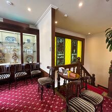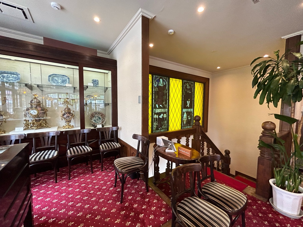 二階のカフェは美術館の様です。先先代の頃から有名絵画や陶磁器ステンドガラスがありましたが、ゆったりしたカフェは時間を作って行くべき。