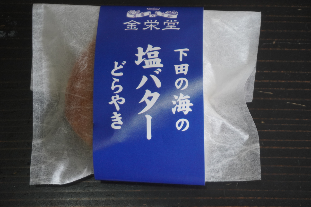 金栄堂菓子店は、伊豆急下田駅から道の駅 開国下田みなとに向かう途中。いくつか種類があったどらやきから一番人気の「下田の海の塩バターどら焼き」をいただきました。ちょっとじゃりっとしたような食感もありましたが、メリハリがあってきりりとした味わいは悪くないですね。一番人気なのは納得です。