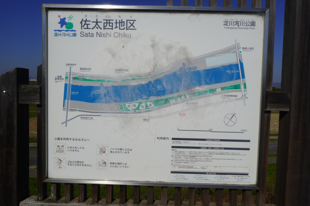 淀川の河川敷には広い範囲に淀川河川公園があって、地区別に区分されています。佐太西地区もその一つ。鳥飼大橋と鳥飼仁和寺大橋のちょうど中間辺りにあって、ここも他地区と同様によく整備されています。二つのグラウンドやテニスコートはいつでもスタンバイの状態でした。