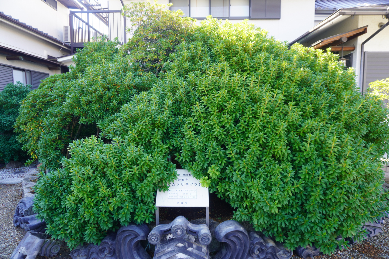 妙楽寺のツツジは、大阪府指定天然記念物。通りから境内に入って、本堂の裏手に抜けるとそこにこんもりとしたツツジの大きな株がありました。樹齢約300年、高さ約3.5m、縦横に4~7mの長さで枝を伸ばしているヒラドツツジです。ツツジはツツジ苑みたいに普通はたくさんの株があって楽しむものだと思いますが、これはひと株でも確かに見応えがありますね。樹勢も強いように感じます。