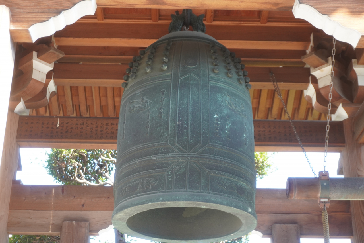 鐘の大きさは、高さ125㎝、口径68㎝。中くらいの大きさだと思いますが、宝永4年(1707年)の銘文があって、鑄物師、岸本仁右衛門尉藤原寛敬が鋳造。左右一対の天人像も確認できました。