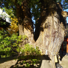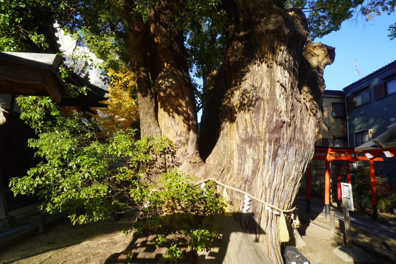 神田天満宮のクスは、本殿横の大木。千年楠という立て札がありましたが、実際の樹齢は800年余り。幹の周囲は10m、高さ約30mの大きさ。根元で二つに分かれているので、それを合わせたサイズだと思います。このテの楠としてはびっくりするほどのものではものではないような気もします。