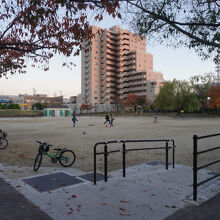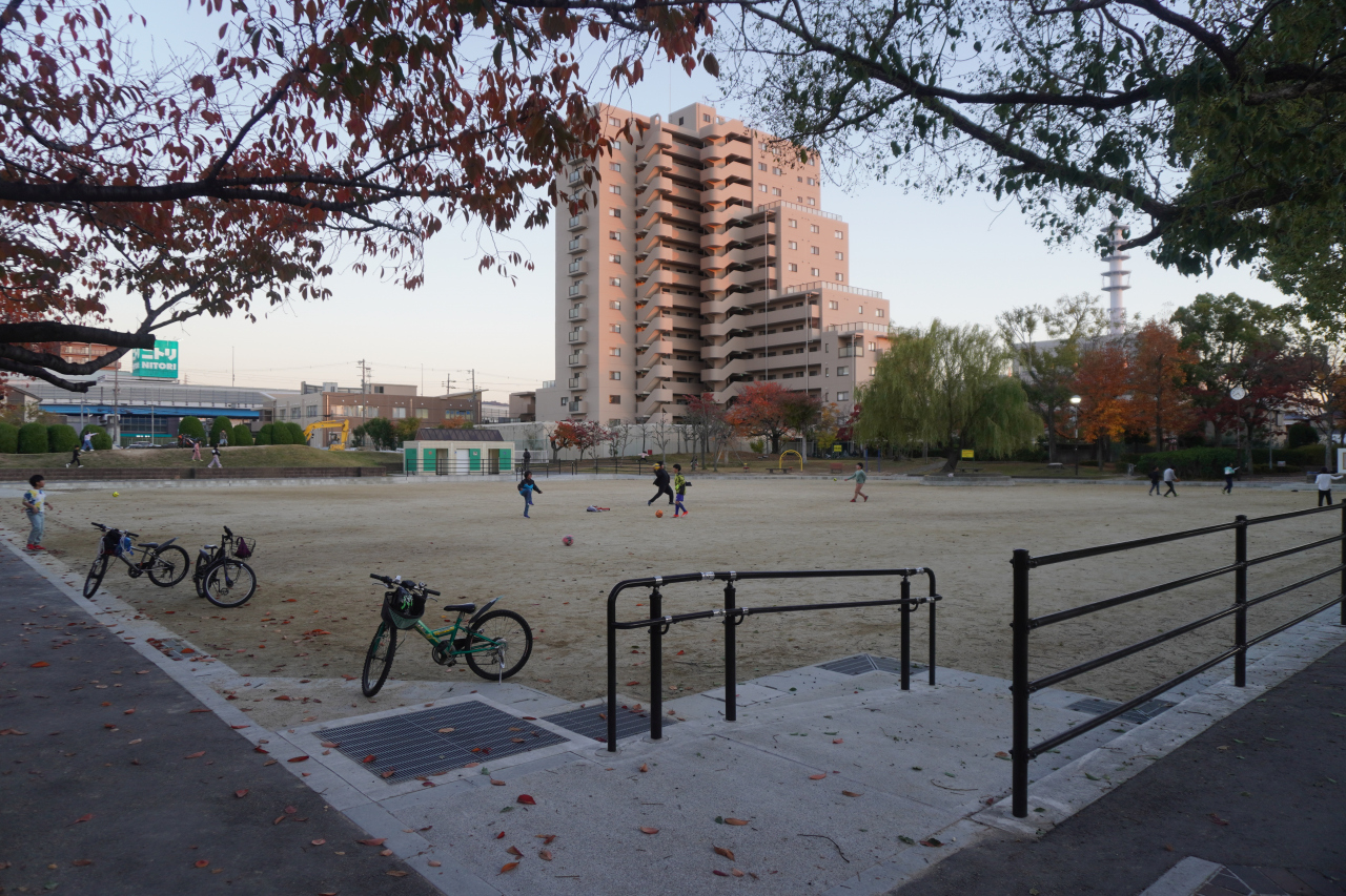 初本町公園は、子供たちが大勢いて大変なにぎわい。しっかりした広さもあるし、小学校の隣りですから、学校が終わってみんなが集まるにはちょうどいい場所というのもあるのでしょう。公園内の並木道の奥には白い平和の塔も建っています。