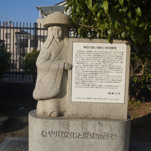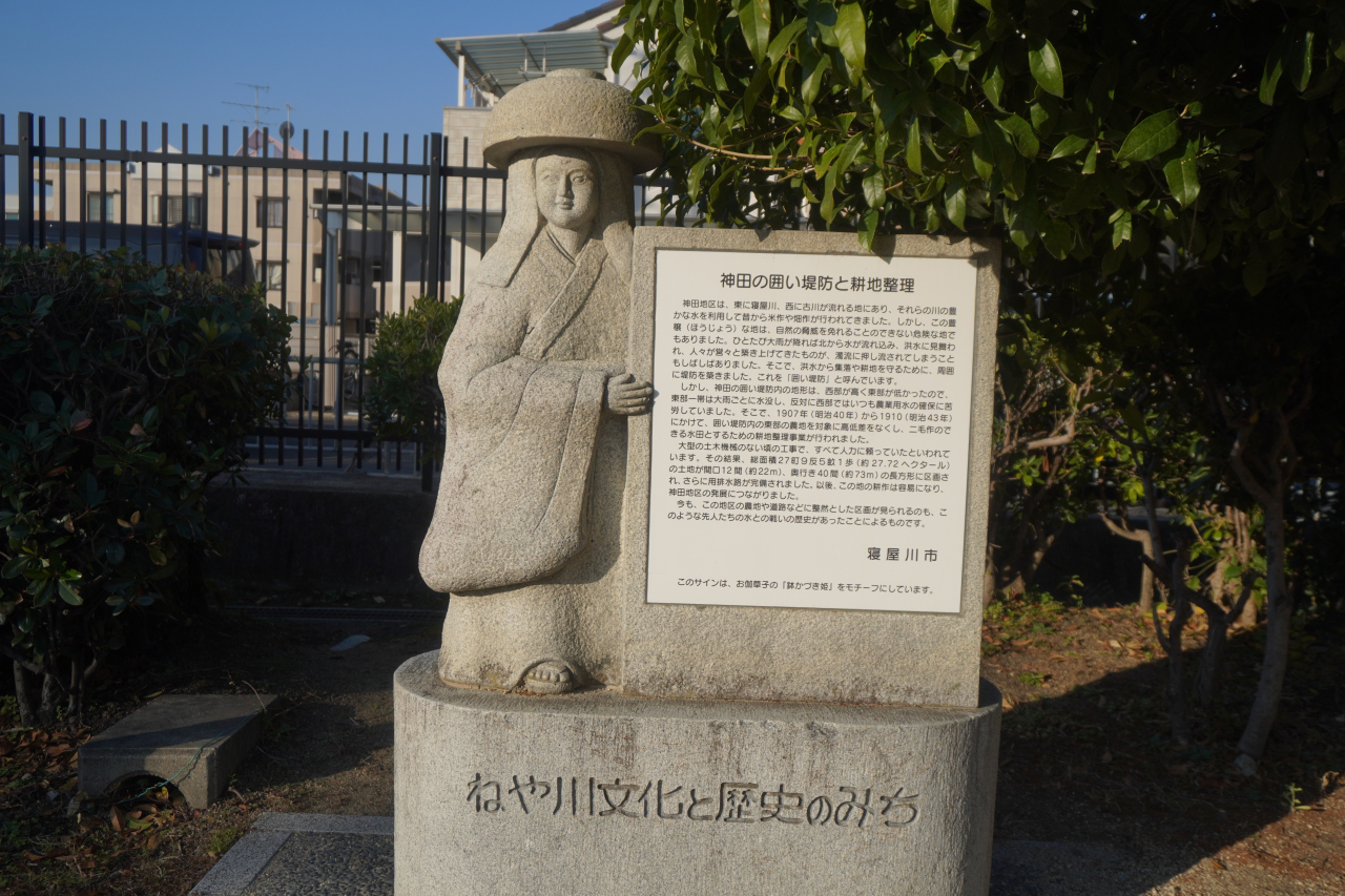 神田中央公園は、そばを寝屋川が流れる都市公園。そこそこの広さはありますが、特にどうということはないですけどね。片隅に「神田の囲い堤防と耕地整理」のはちかづき姫の解説板があって、村の周囲には外からの水を防ぐための囲い堤防が築かれていたとありました。