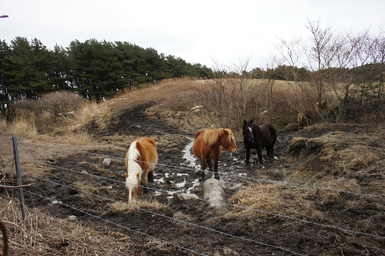 尻屋崎の寒立馬は、放牧された馬なので野生の馬というわけではありません。ただ、寒気と粗食に耐え持久力に富む農用馬として重用されてきたというだけに、北の大地に相応しい朴訥とした存在感がいいですね。柵の外から眺めていたら近くまで寄ってきてくれました。